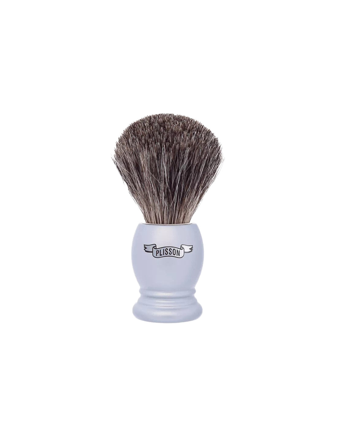 This shaving brush from Plisson's Essentiel collection features a classic handle design, offering a secure and comfortable grip during use.
