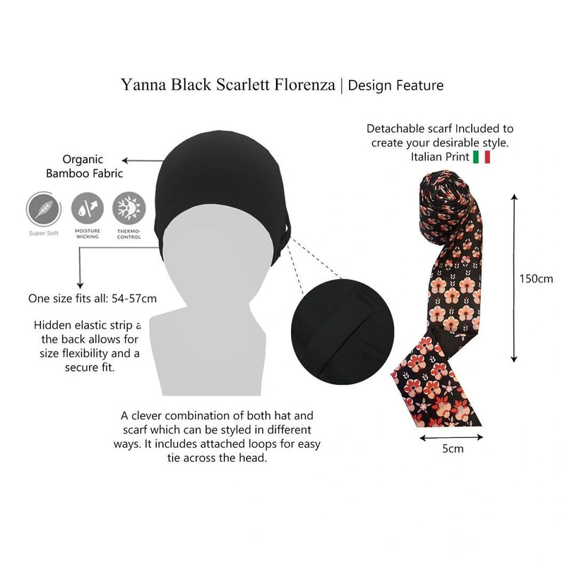 Yanna Black Scarlet Florenza is one of the customer favorites, featuring an organic bamboo hat adorned with a stunning new print designed in Italy.