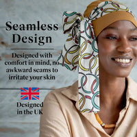 The Yanna Camel Cerchio Elegant is a sophisticated style exuding elegance. It features a cream-colored headscarf that blends seamlessly with its camel chemo cap, adorned with a printed motif of large green, red, camel, and yellow interlocking chains.