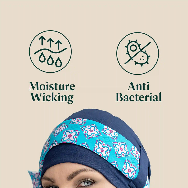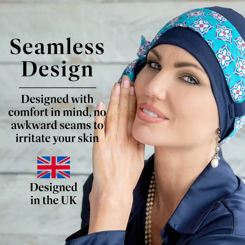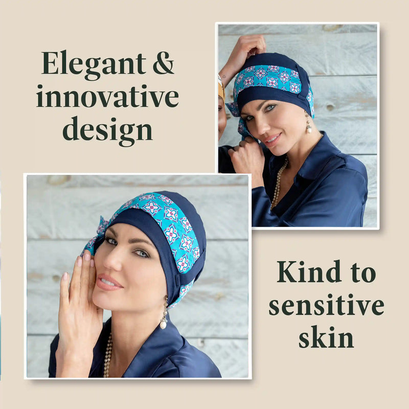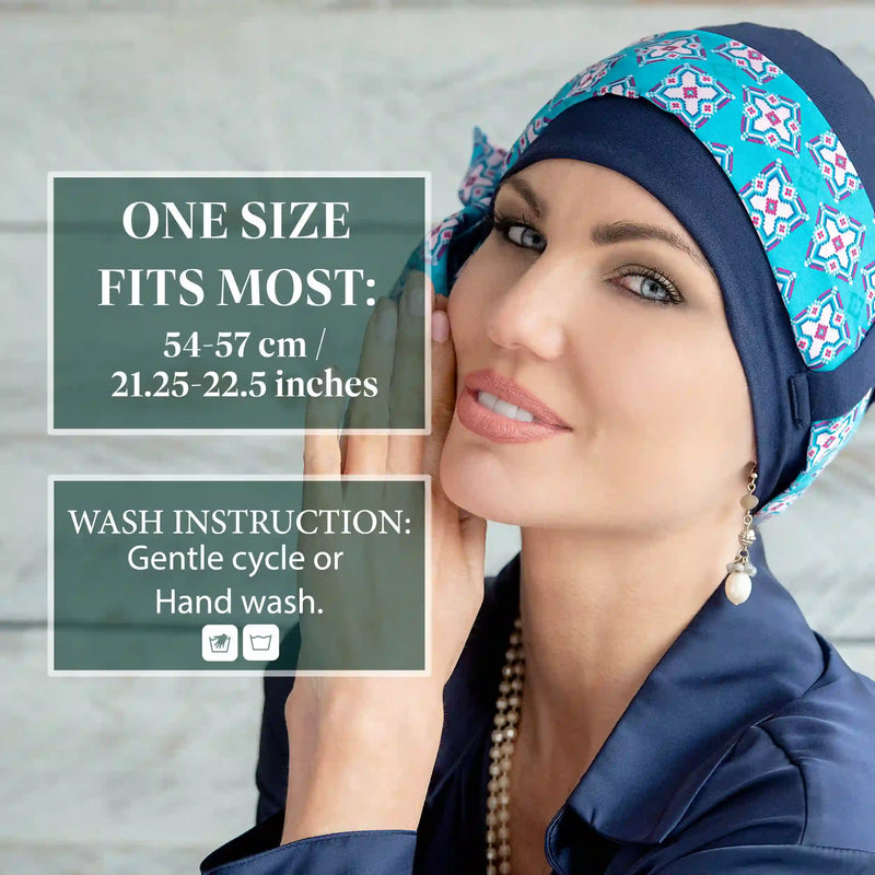 The Yanna Navy Sky Flora offers a stunning look with its hypnotic floral-inspired printed motif. The chemo scarf beautifully partners with its navy blue-colored chemo cap.