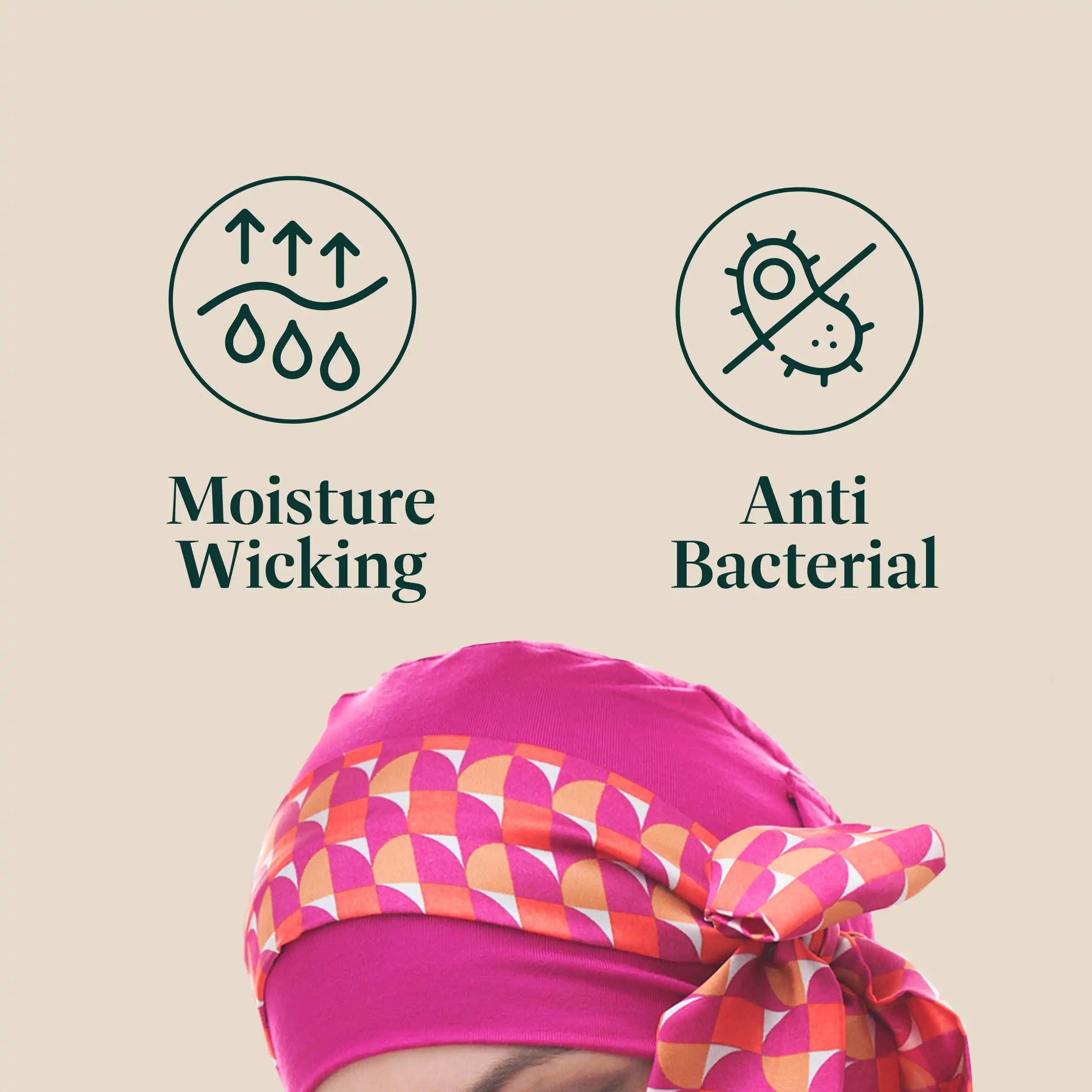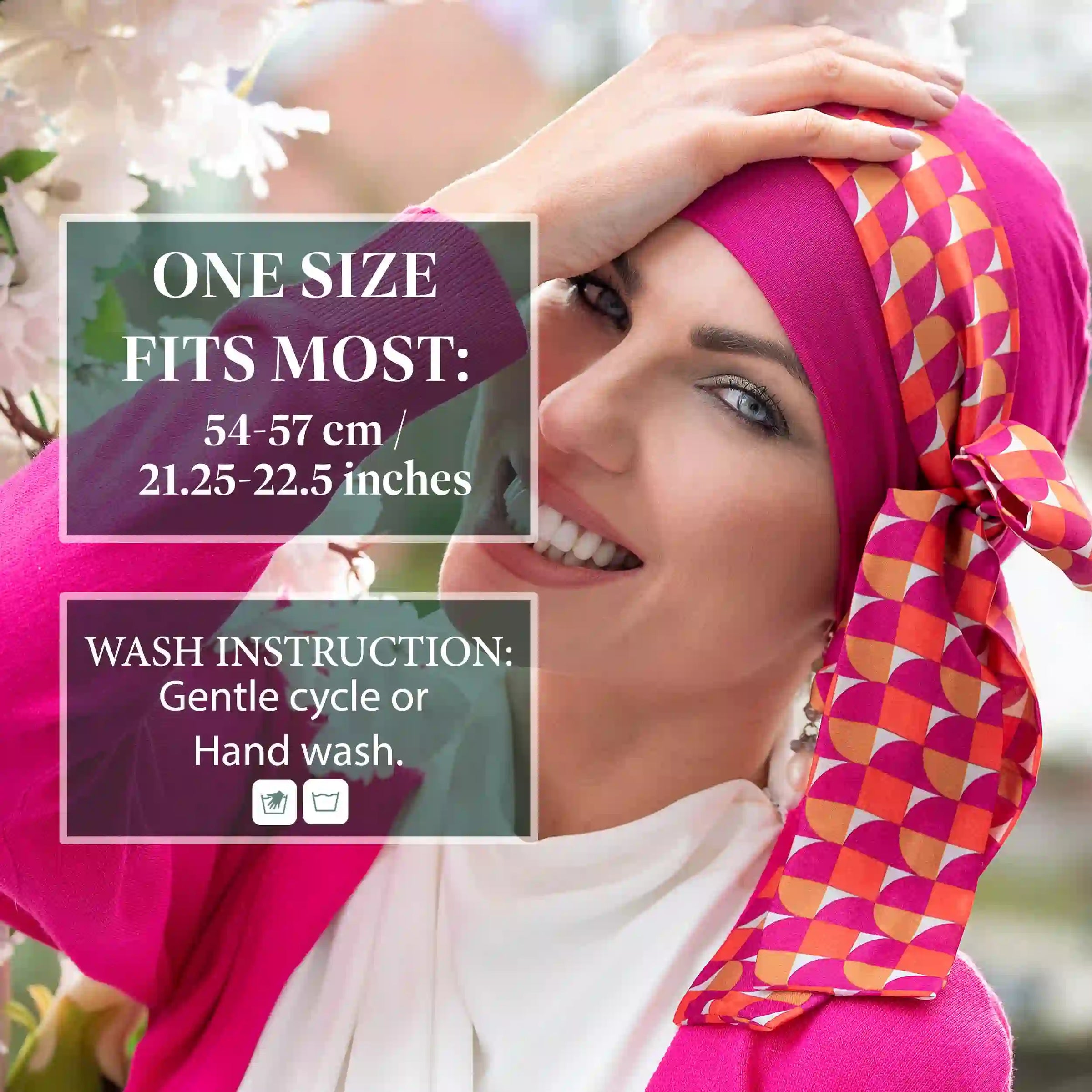 Like all Yanna styles, it includes a headscarf and chemo cap combination, offering ample styling flexibility to suit your preferences. The pink chemo cap naturally enhances the color of your face, while the loops ensure the scarf stays in place. Additionally, the double-layering technique prevents scalp irritation. Yanna Purple Golden Allure is an excellent headscarf choice for women experiencing hair loss, providing both style and comfort.