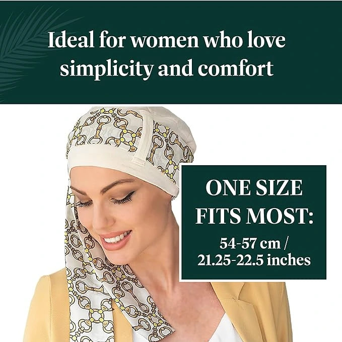 For those seeking an understated look, the Yanna White Golden Chain head scarf is perfect. Crafted specifically for those experiencing hair loss, it is made from bamboo fabric and features contemporary chains linked together. Dark outlines surround these Italian printed motifs, highlighting the trendy design. The bamboo fabric is superbly soft, making it ideal for women experiencing hair loss. Additionally, it is sustainable, organic, and eco-kind to the planet.