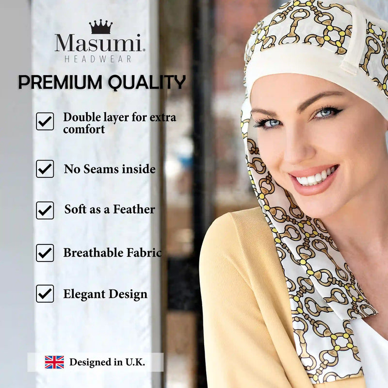 Yanna chemo head scarves for hair loss by Masumi Headwear offer great versatility. The detachable scarf is a fabulous element., allowing it to be used as a wig accessory or hair. Various tying methods give you the opportunity to add your unique flair. Experiment and find what suits you best!