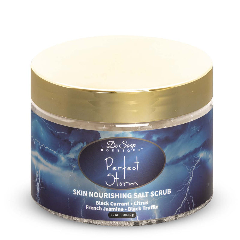 Our Perfect Storm Skin Nourishing Salt Scrub is the perfect solution for dull, lifeless skin. It delicately removes the dead outer layer to reveal your luminous, natural glow. Fragrance include black currant, citrus, french jasmine, and black truffle. Potent Hyaluronic Acid keeps skin looking its youthful best.