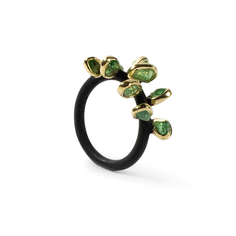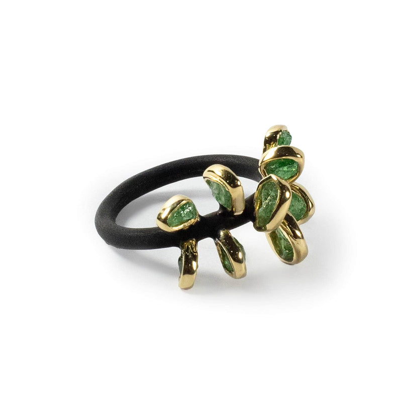 This ring exemplifies German Kabirski's distinctive design philosophy, featuring natural raw Tsavorite crystals arranged unconventionally. Each stone is carefully wrapped in silver and set at an unexpected angle against the sleek band, creating a captivating visual that makes a subtle yet bold statement. The band is plated with both Anthracite and Gold, which enhances its overall look and adds a touch of sophistication. This piece perfectly illustrates Kabirski's talent for marrying uniqueness with elegance in jewelry design.