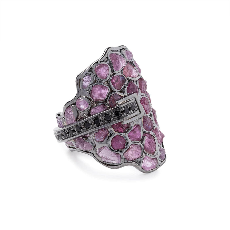 This designer ring is created using our Stained Glass technique, featuring rough Pink Sapphires in their natural form. A contrasting line of round-cut Black Spinel melee runs through the design, accentuating the raw sapphires. Made from 925 Silver and plated with Black Rhodium, the ring boasts a distinctive and elegant look. Encased in dark, lustrous metal and arranged like a natural puzzle, this piece embodies the wabi-sabi philosophy of designer German Kabirski, who appreciates the energy and beauty of unrefined gemstones. This unique, handmade ring guarantees an individual and original appearance.