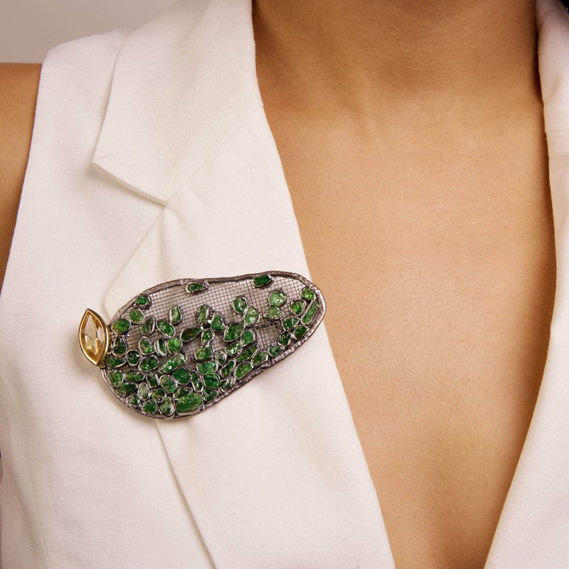 This designer brooch honors uniqueness and authenticity. It features an intricate silver and titanium mesh mix, finished with black rhodium and 18K gold plating. Scattered rough tsavorite crystals sparkle with natural, unrefined beauty, capturing the raw essence of nature. In striking contrast, a flawless marquise-cut citrine graces the side. This one-of-a-kind piece is a tribute to those who embrace the wild and imperfect beauty of life.