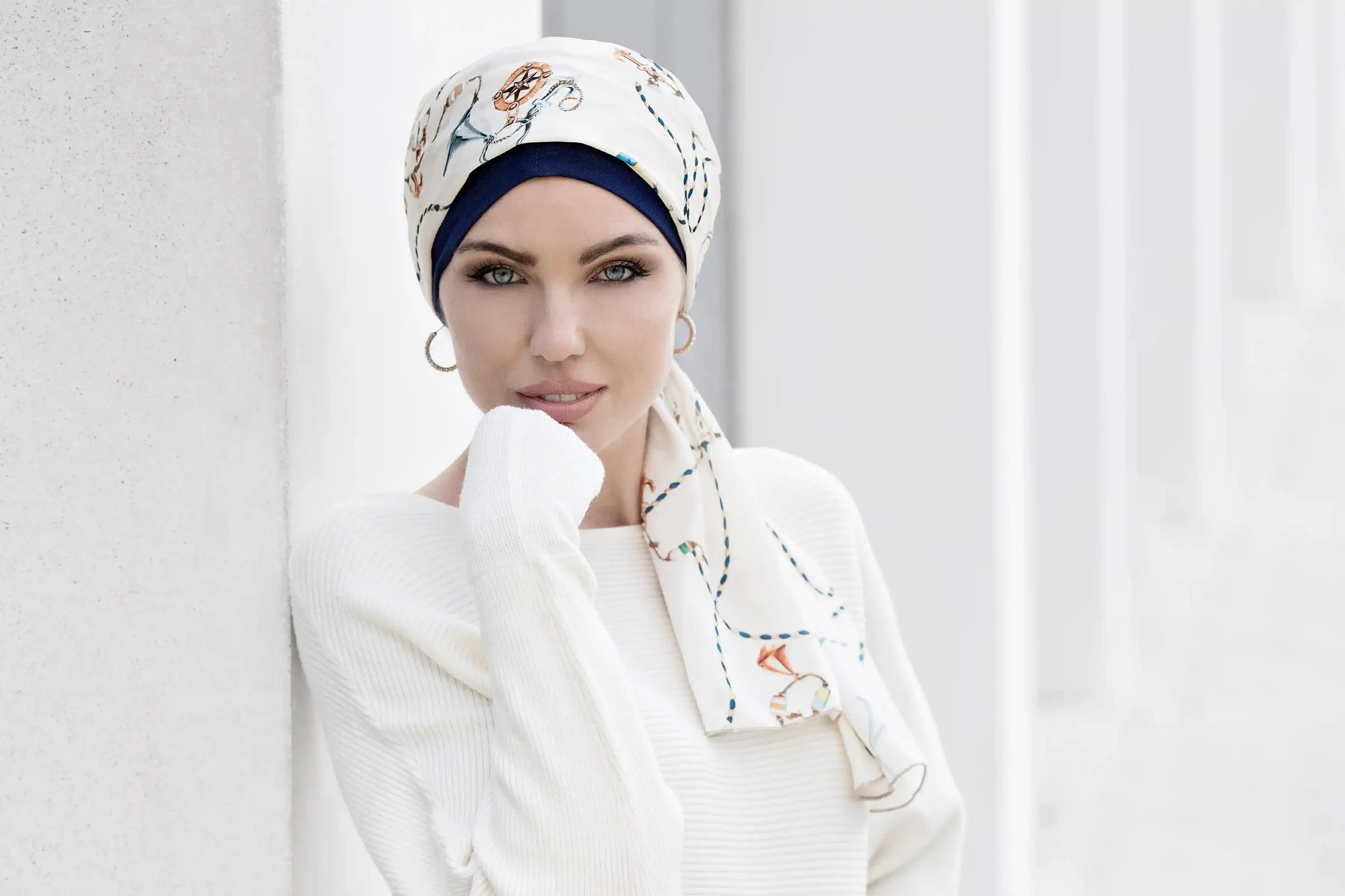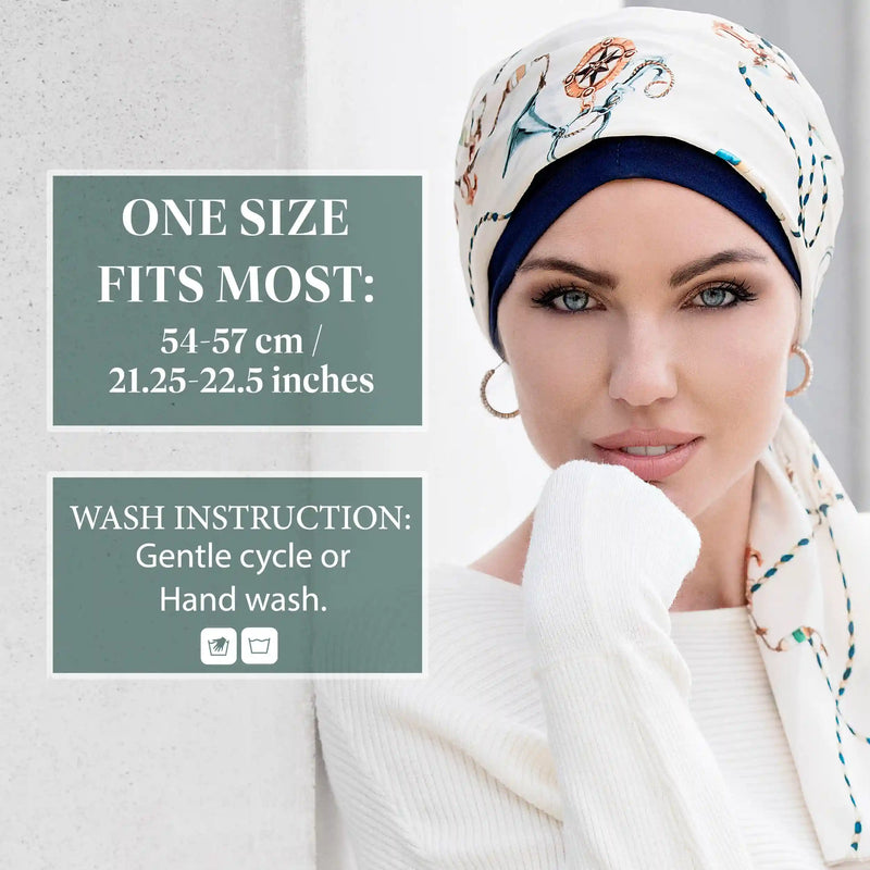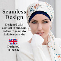 The Daisy Navy Spiral Ocean is an incredibly versatile printed headscarf, featuring a wide scarf attached at the back that can be tied in various styles, such as a turban or wrapped around the neck. Made from soft, luxurious cotton fabric, it offers a comfortable fit for women experiencing hair loss.