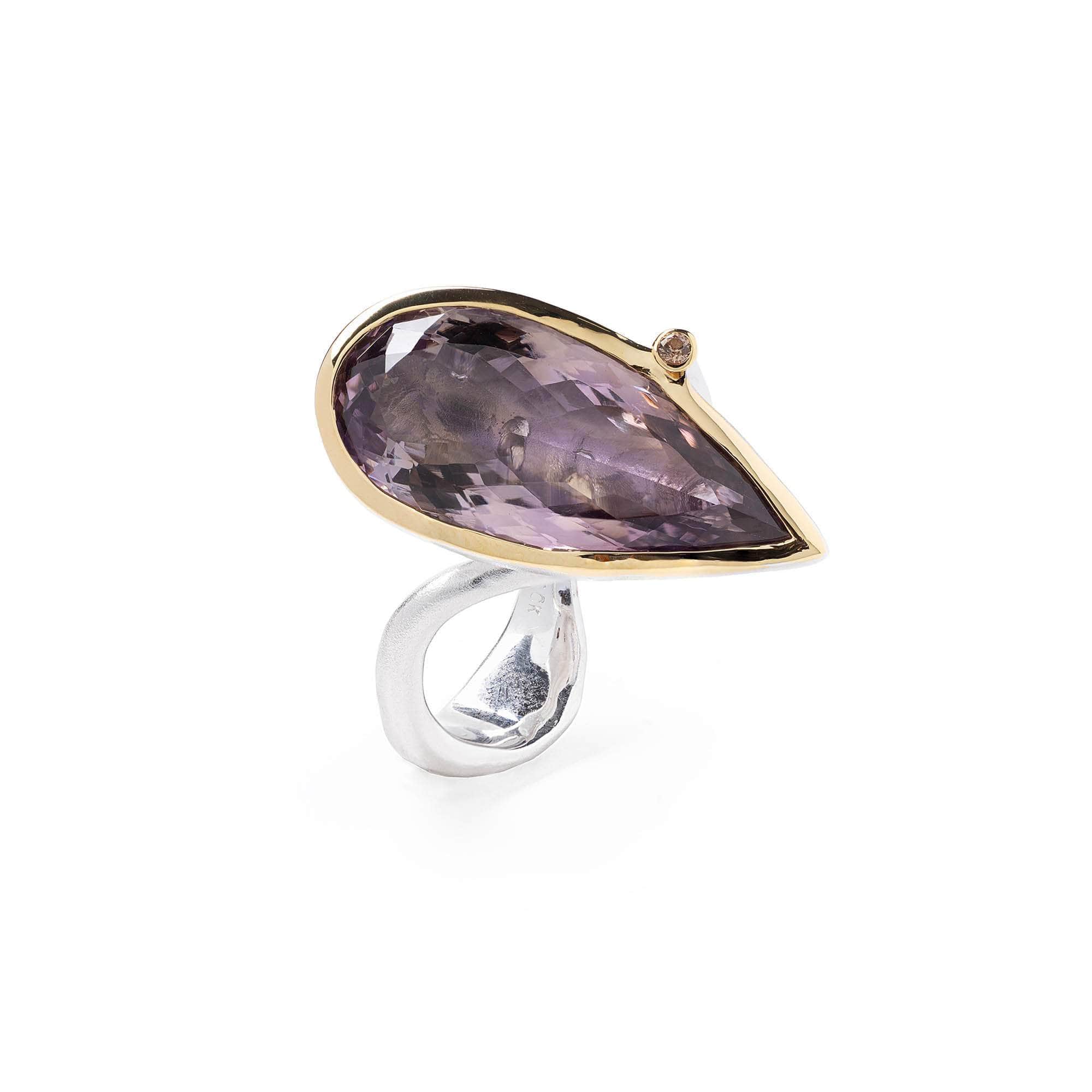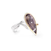 This striking German Kabirski ring showcases a large, narrow pear-cut Ametrine, with its natural purple and yellow tones shaped over millions of years by deep-earth temperature and pressure changes. A small Orange Sapphire set into the band adds a vibrant accent. Plated with White Rhodium and 18K Gold, it exudes a sleek, modern aesthetic that commands attention. Designed for those who embrace individuality and reject the ordinary, this ring is crafted from premium natural materials. Handcrafted and one-of-a-kind, it offers a personal connection and makes a bold statement of self-expression.