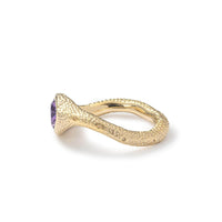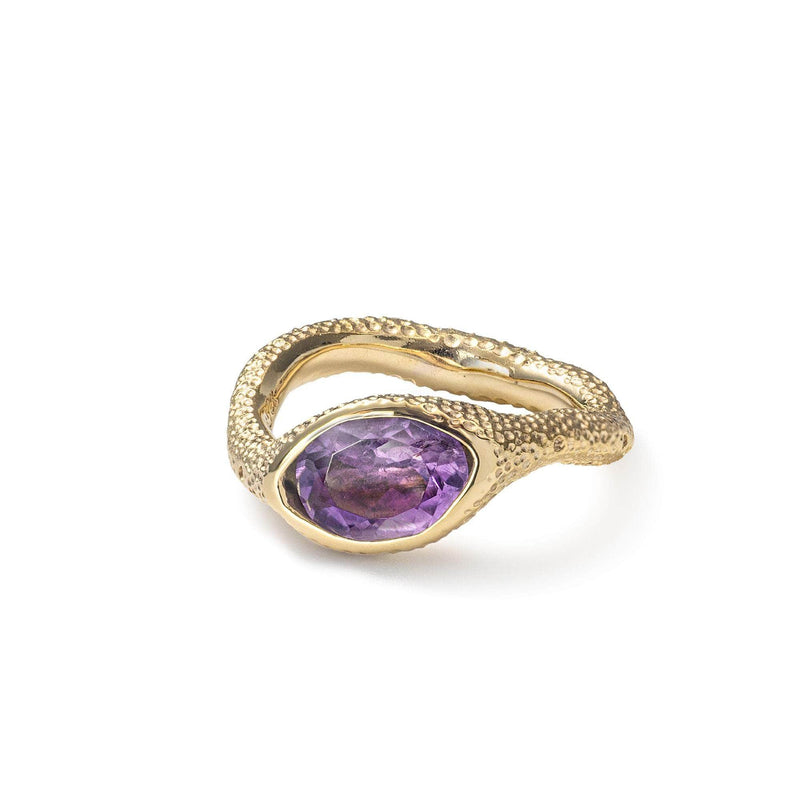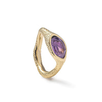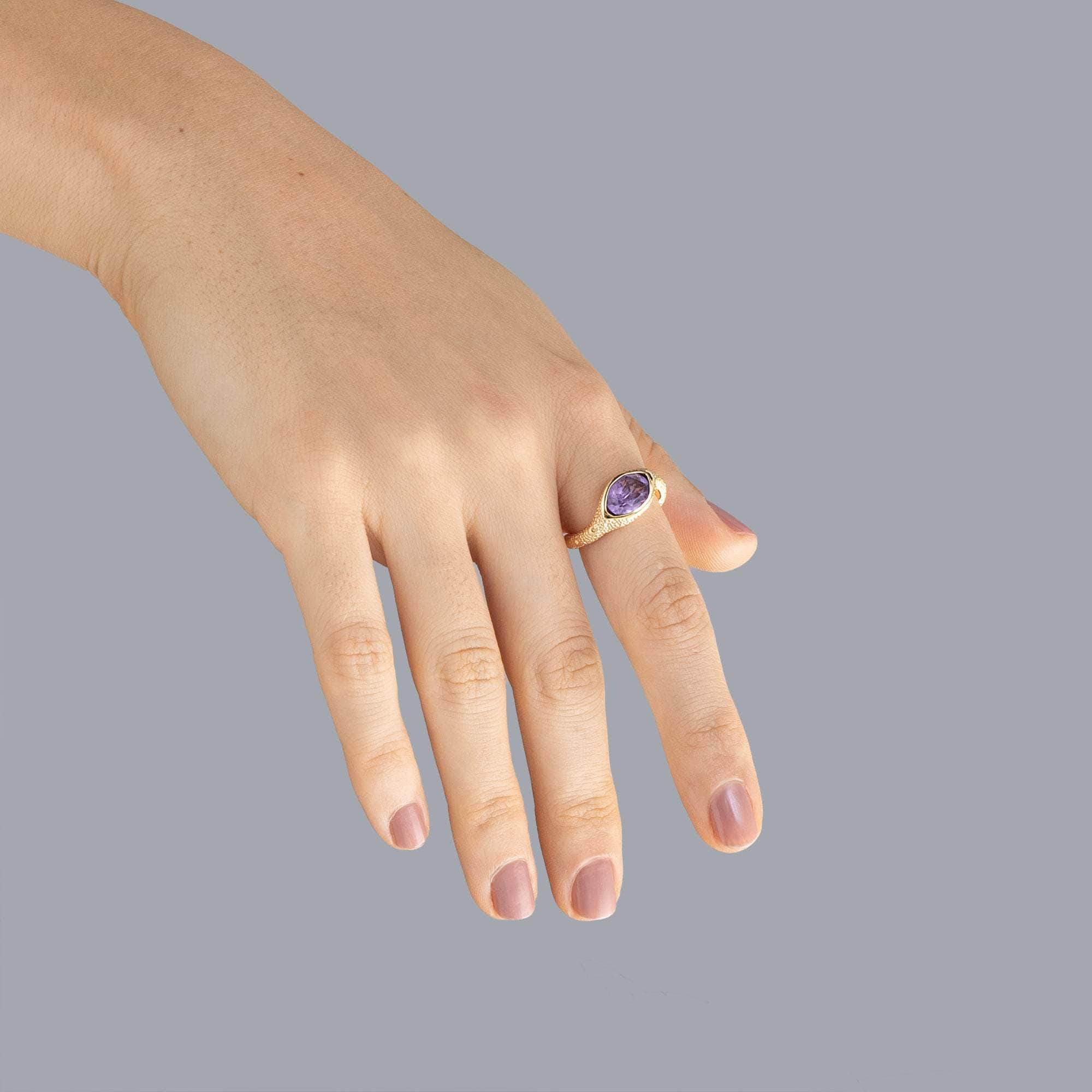Introducing a standout piece from German Kabirski's latest Bacchus Bunch Collection: a minimalist yet bold designer ring. With an organic texture and slightly curved band, this ring exudes a unique and edgy appeal. Crafted from 925 Silver and plated with 18K Gold, it offers both style and hypoallergenic comfort. The focal point is a large 7x9 mm oval-cut natural Amethyst, adding a raw, artistic element. Subtle yet striking, this ring reflects the wearer's individuality without being overly flashy.