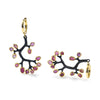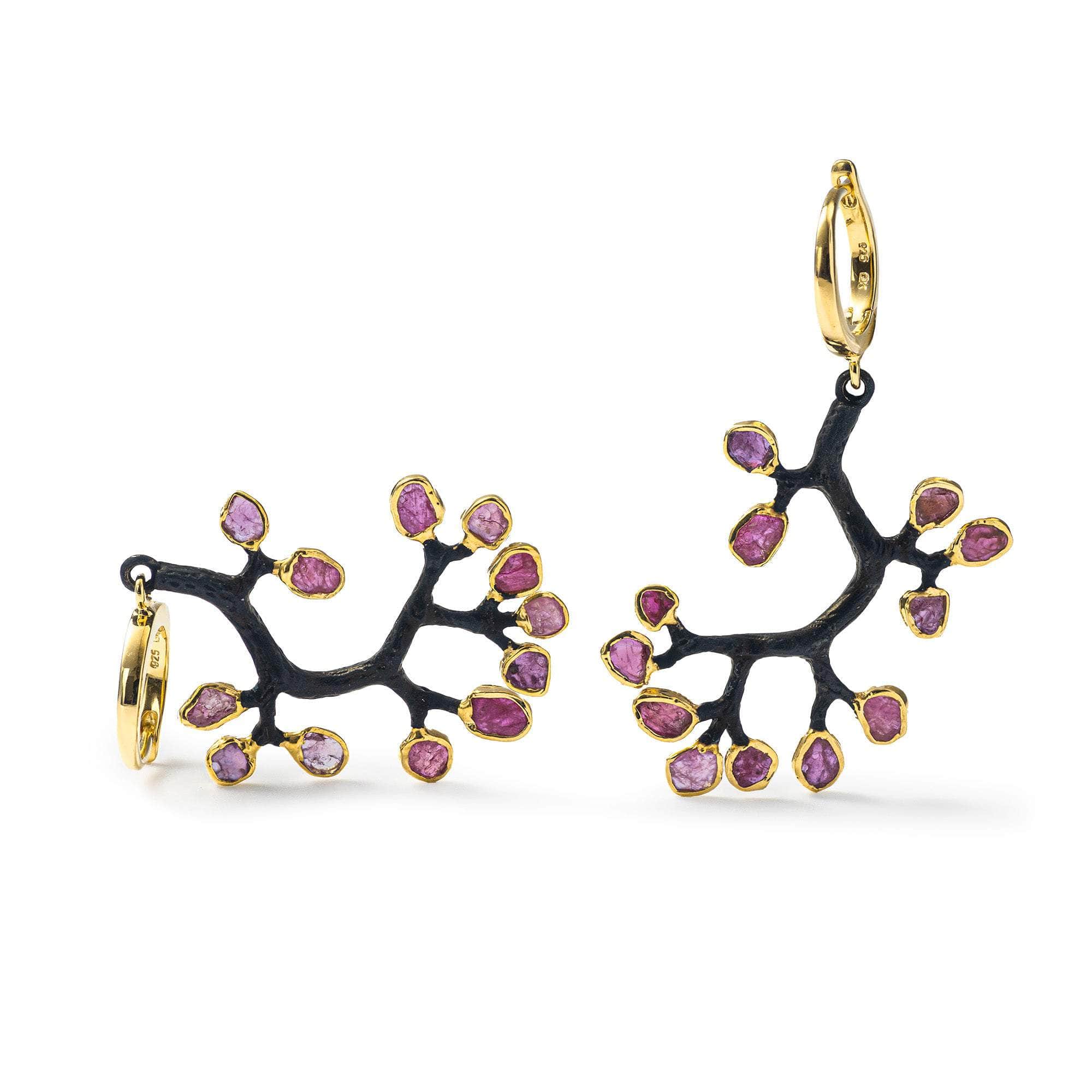 These designer earrings are crafted from silver with 18K gold-plated locks and finished with German Kabirski's signature deep-black Anthracite coating. The design mimics a tree branch, with natural, uncut ruby crystals forming the leaves, left in their raw, untouched state. Handmade with careful attention to detail, these earrings celebrate organic beauty and allow you to express your inner self. Ideal for those who appreciate natural elegance and unique, artisanal craftsmanship.