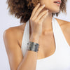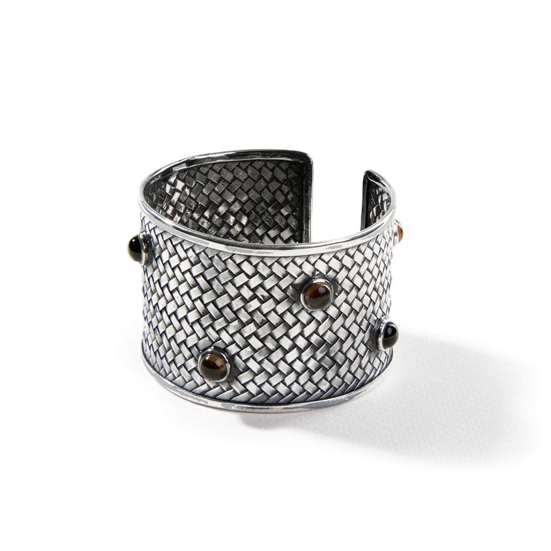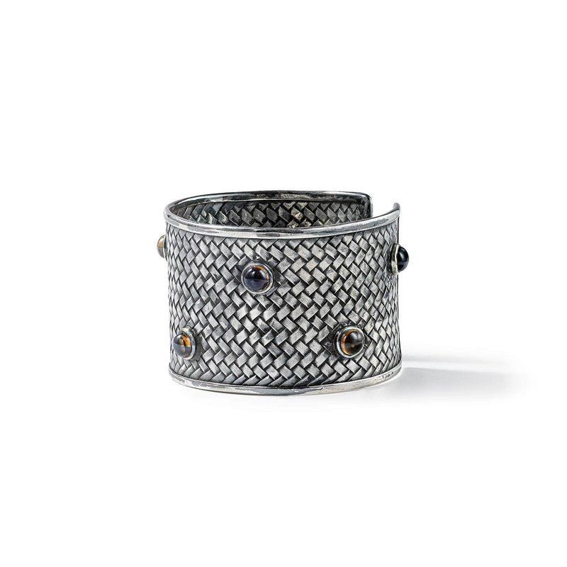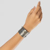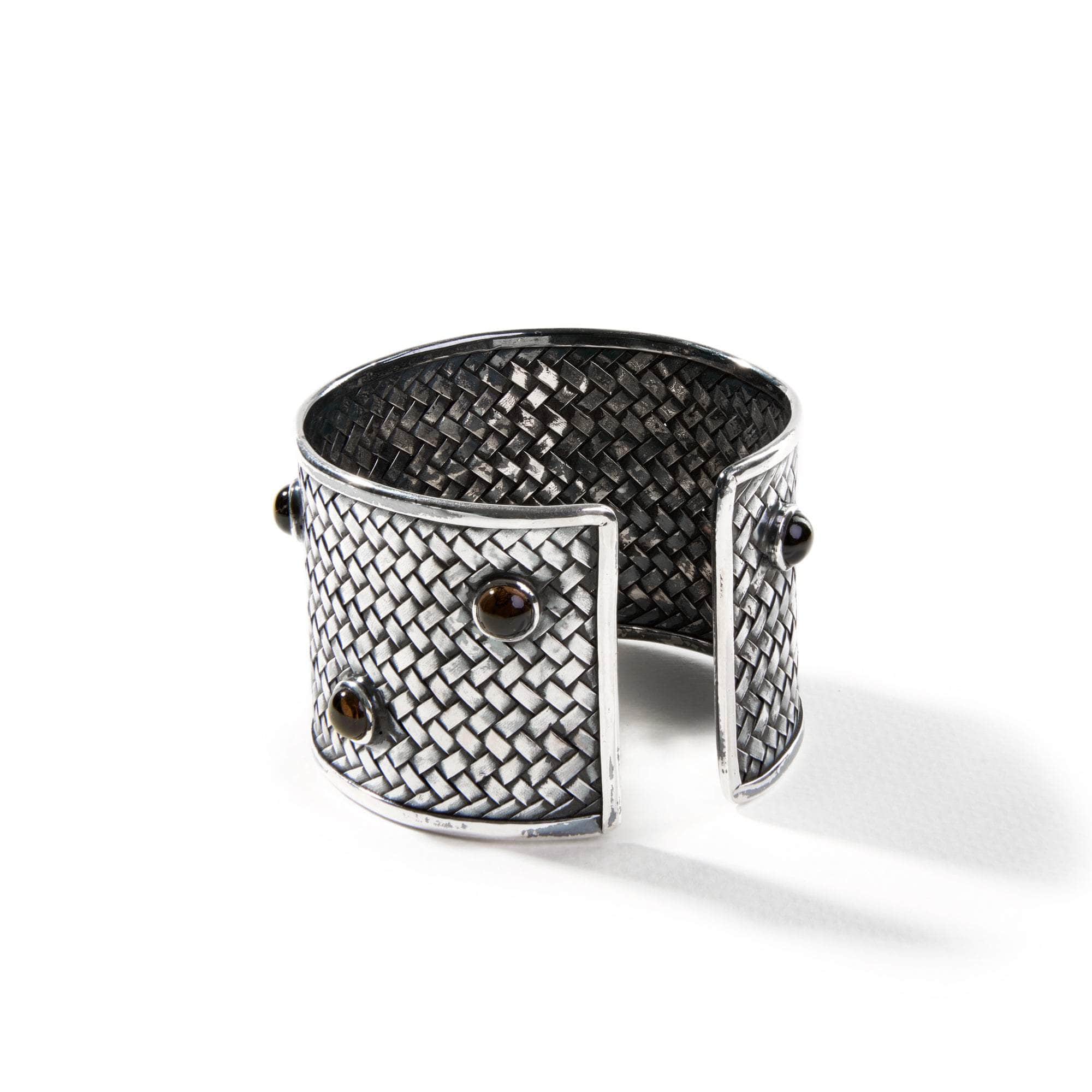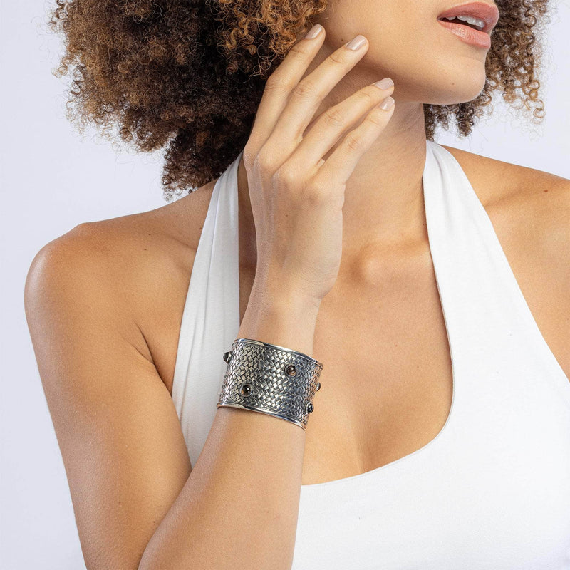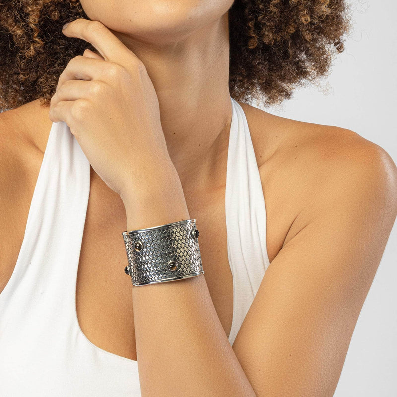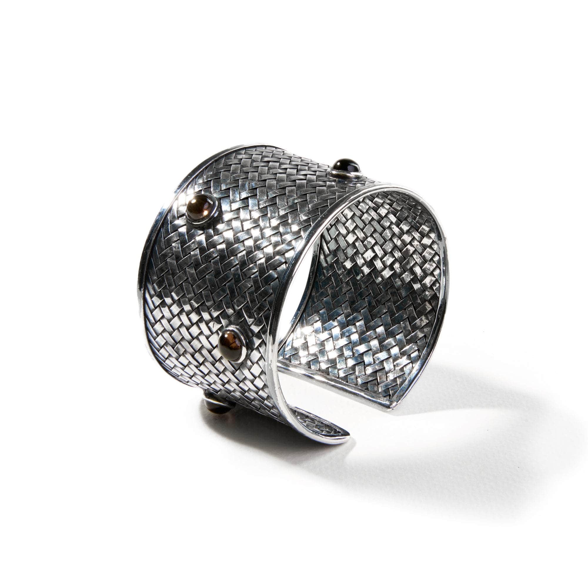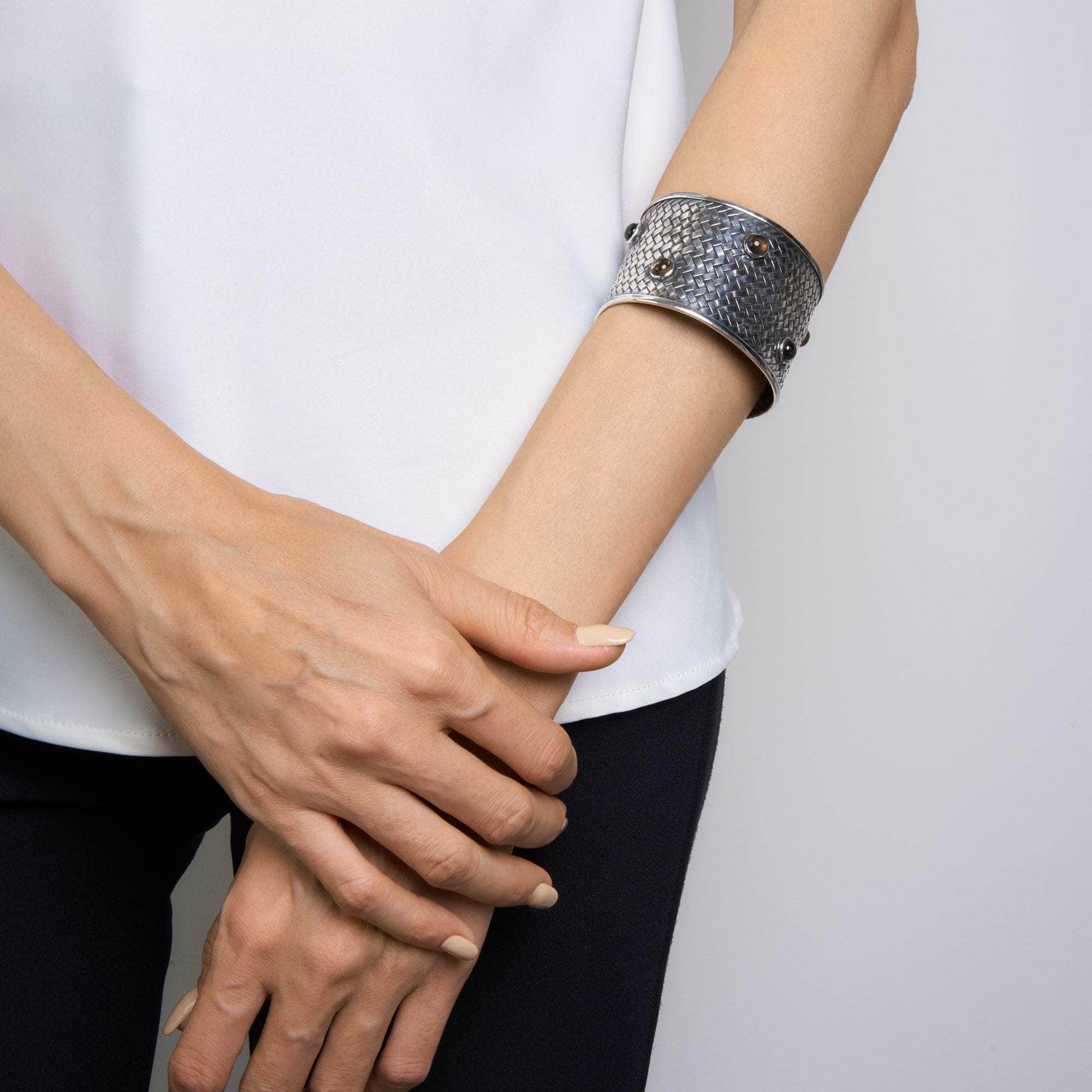 This handcrafted designer bangle is made from oxidized silver, featuring an intricate weave that adds a distinctive texture. At its center, a round cabochon smoky quartz adds natural elegance. Blending artistic expression with a nod to nature, this piece stands out for its unique craftsmanship and striking aesthetic.
