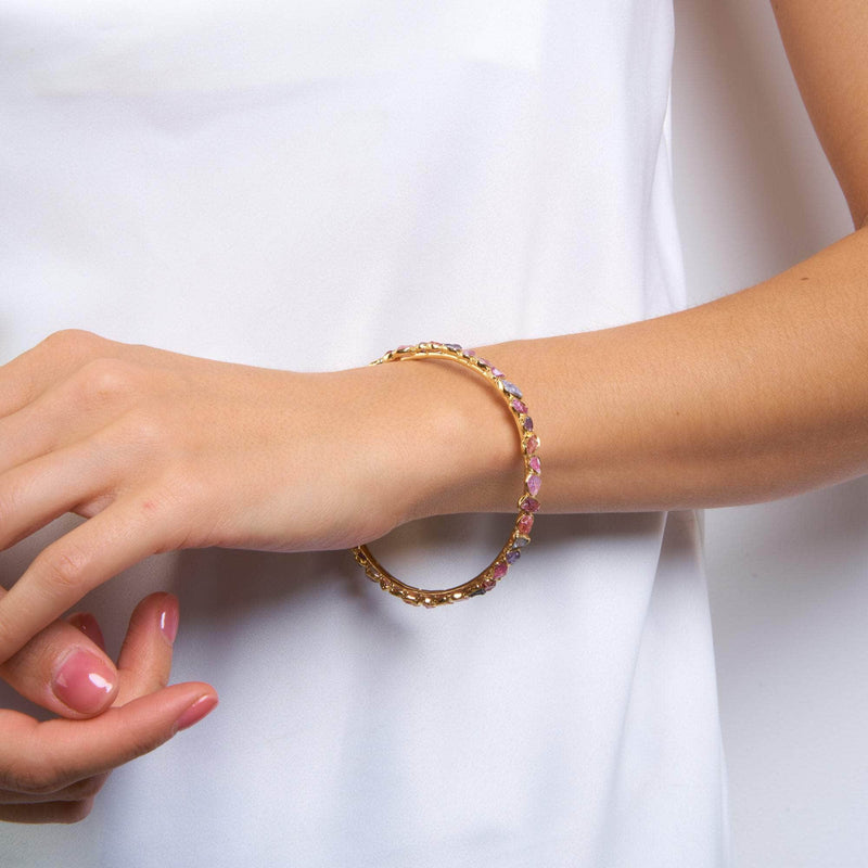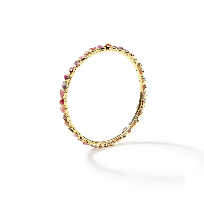 This handcrafted bracelet is a piece of wearable art, featuring 18K gold-plated silver and raw, natural pink spinel crystals. Each spinel is encased in silver, forming a sophisticated yet unique design. German Kabirski's innovative style reflects an artistic expression that highlights the wearer's individuality and authenticity.