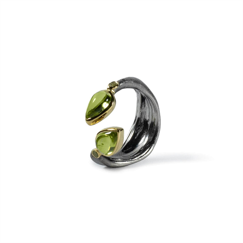 This open band ring seamlessly fuses natural elements with modern style. Crafted from silver, it features dual plating, with black rhodium covering the band and gold accentuating the gemstones. At its center are two pear-shaped cabochon Peridots, beautifully balanced by two smaller round-cut Peridots, offering a harmonious play of color and form. The design reflects an organic connection to nature while presenting a contemporary aesthetic that highlights the natural beauty of the stones.