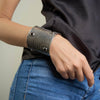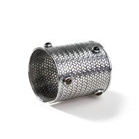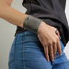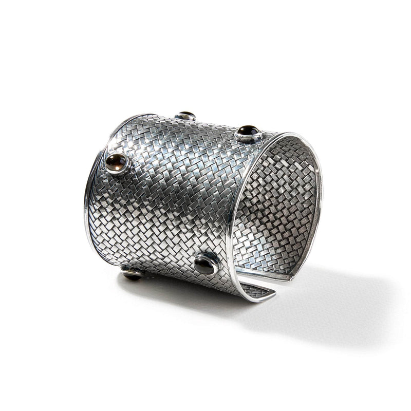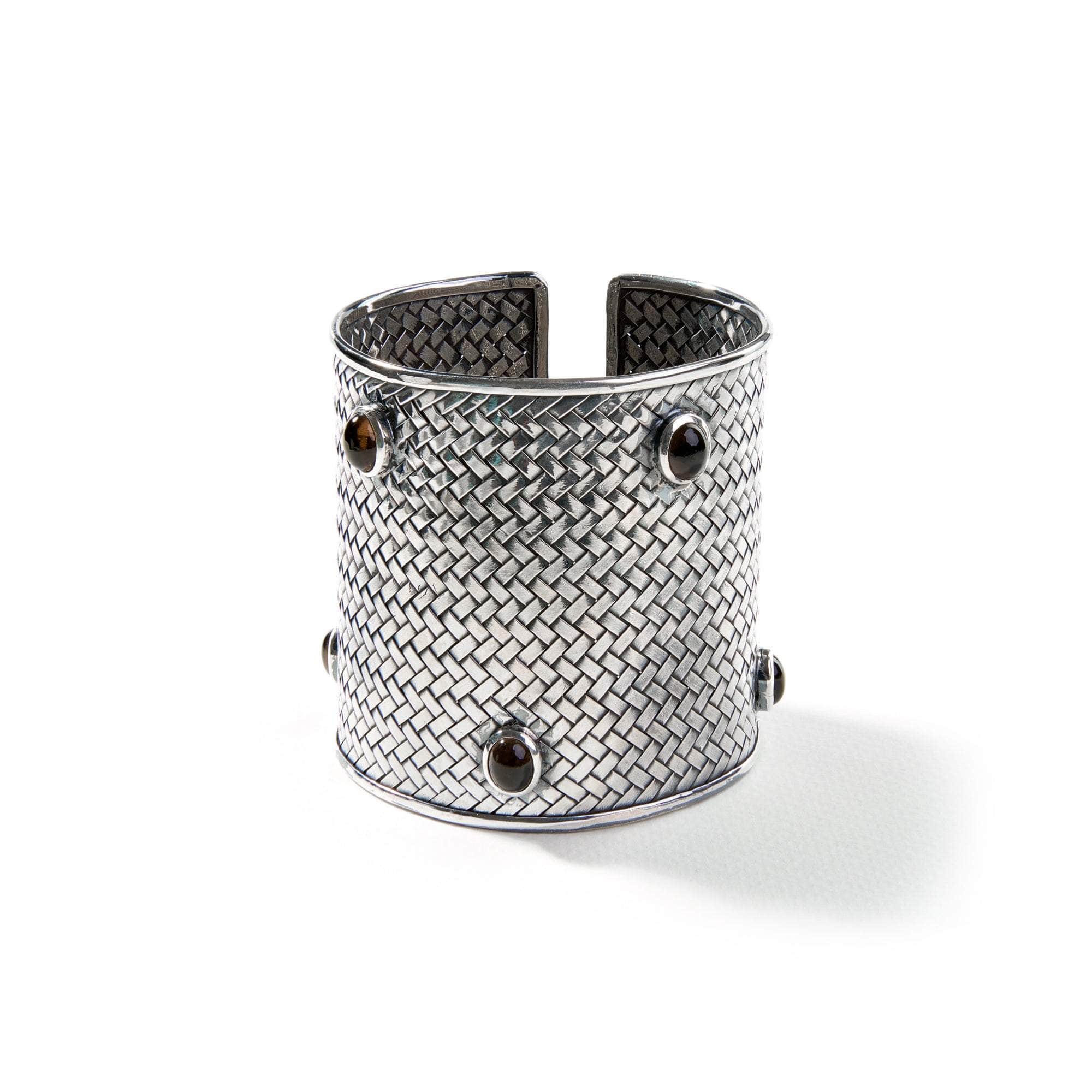 The German Kabirski wide bracelet, handcrafted in the hill tribe style, showcases an intricate woven design and natural smoky quartz gemstones. This artistic piece evokes a connection to simpler living and the beauty of natural forces. With its earthy charm and handmade craftsmanship, it embodies simplicity and the allure of nature.