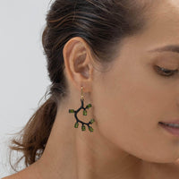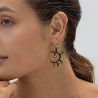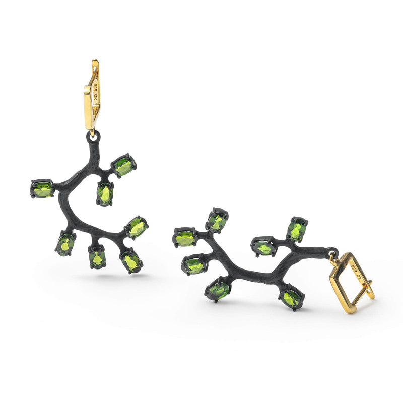 These distinctive asymmetric earrings showcase a bold design inspired by tree branches, crafted in silver with a Black Anthracite finish. The clasps are highlighted with 18K Gold, adding to the organic theme. Embellished with natural Imperial Diopside, also called Chrome Diopside, the vivid green stones evoke the essence of the forest. The contemporary, branch-like design offers a striking and modern take on nature-inspired jewelry.