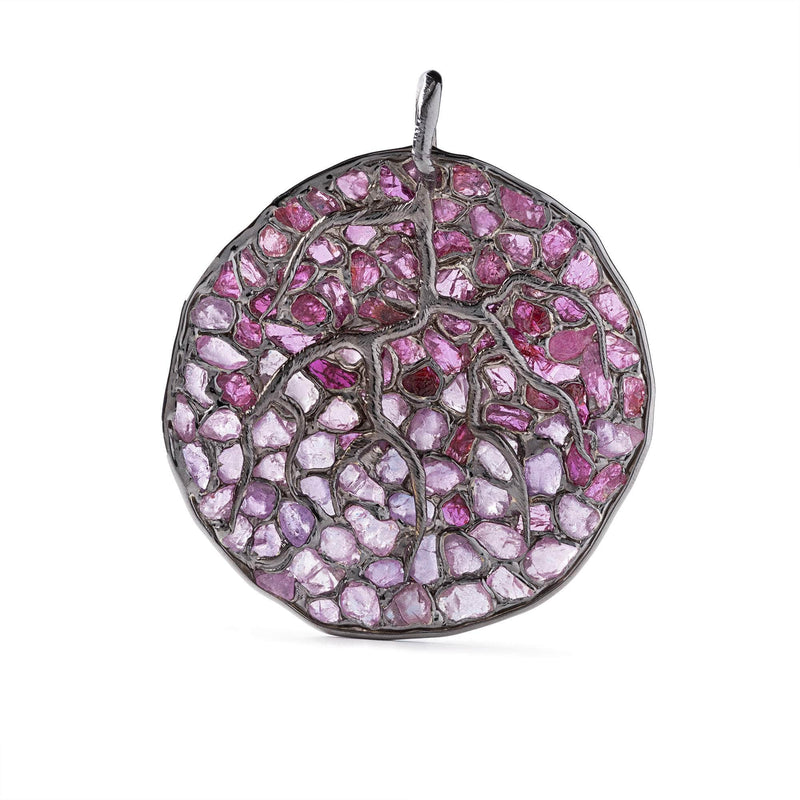 This modern pendant by visionary designer German Kabirski stands out as a truly original creation. Kabirski seeks to elevate jewelry from simple adornment to a form of self-expression and art. Made from sterling silver with black rhodium plating, it features raw Pink Sapphire and Ruby crystals, assembled through the innovative Stained Glass technique. Bold and unconventional, this piece is perfect for someone who values natural beauty and embraces being wonderfully unique and different.