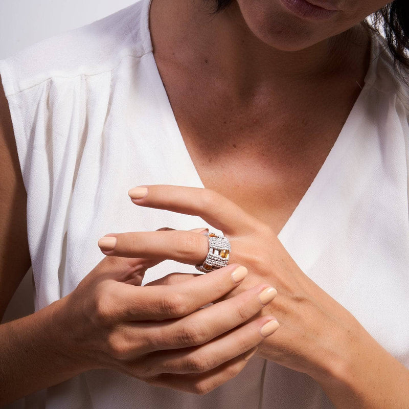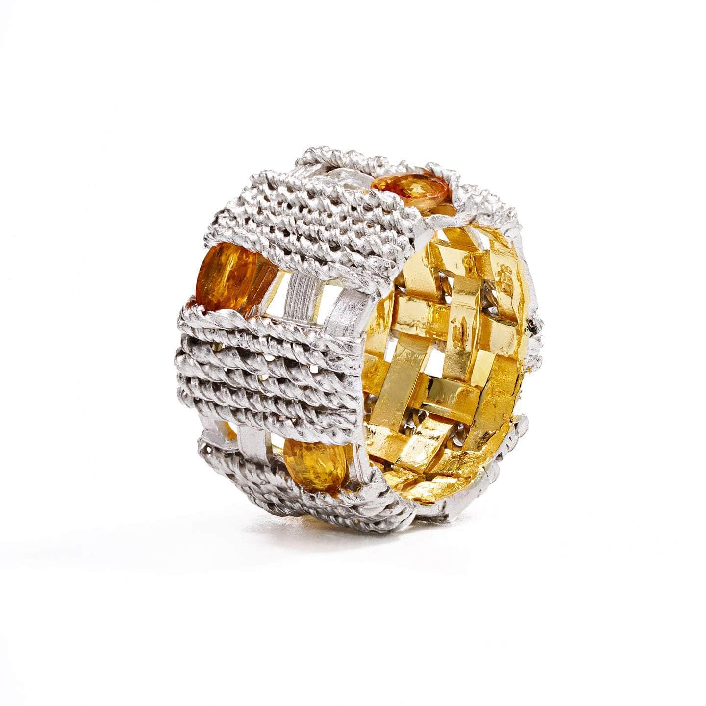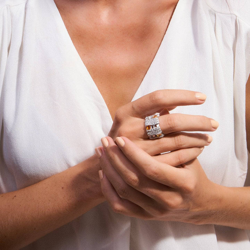 Rare and radiant, orange sapphire gemstones shine with an enchanting inner glow. Set against a backdrop of gleaming white rhodium, their warm brilliance captivates the eye. Elegant gold accents add a touch of vibrancy, enhancing the fiery allure of this stunning piece.