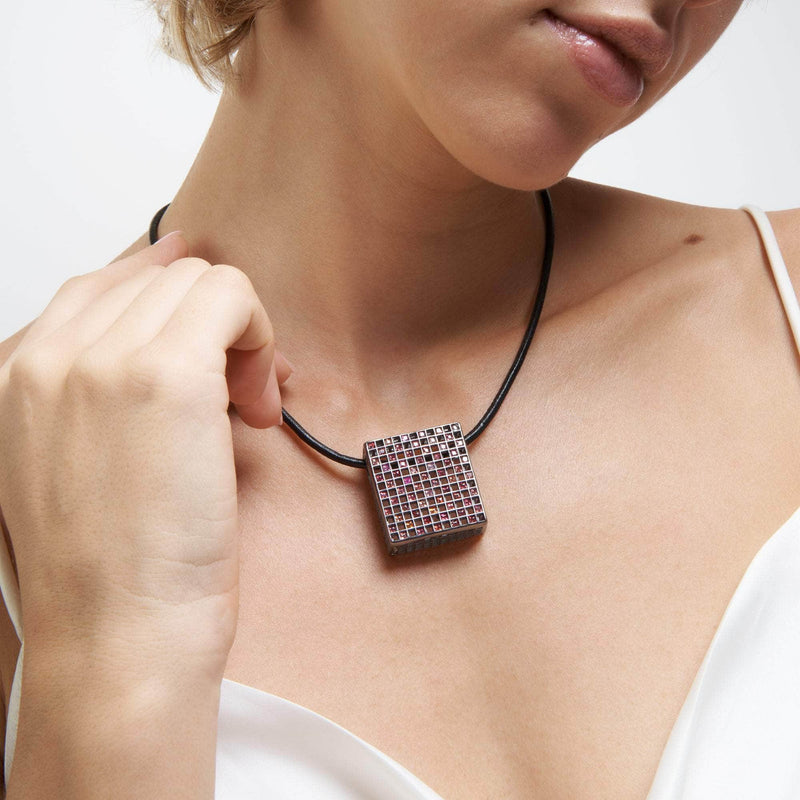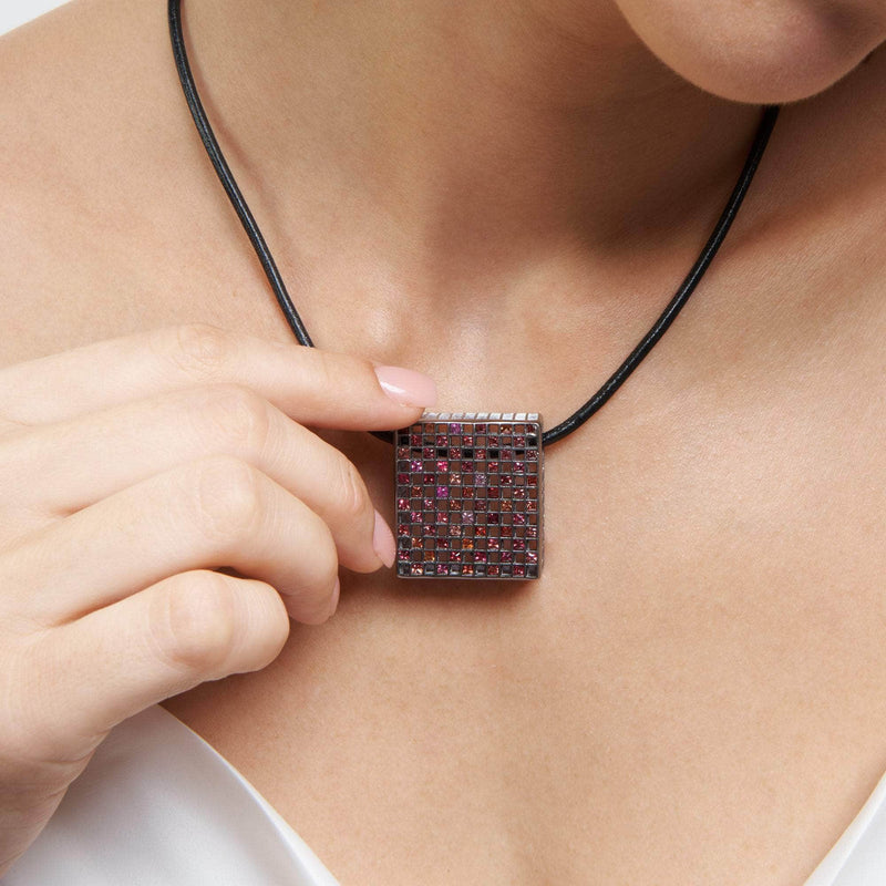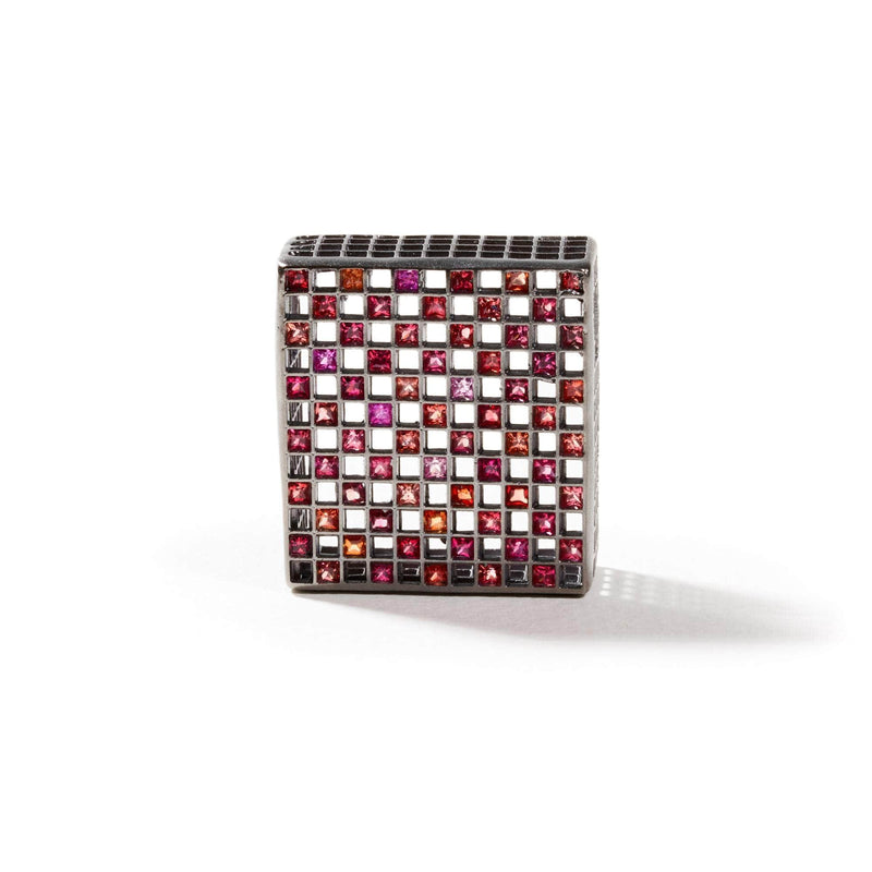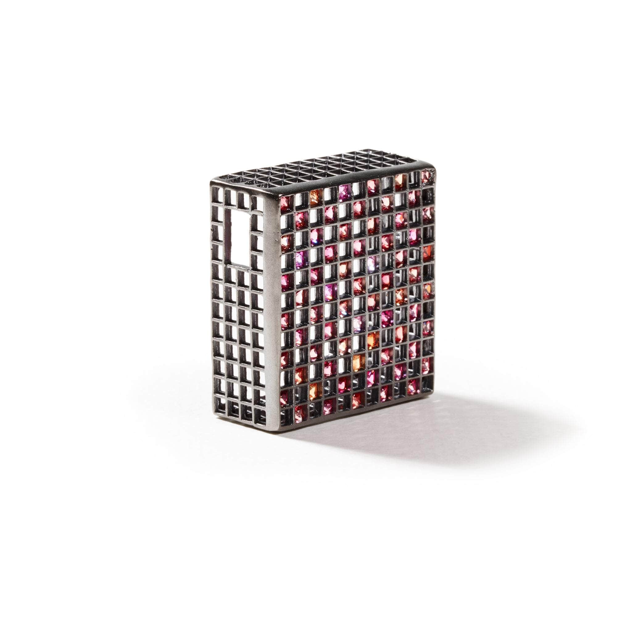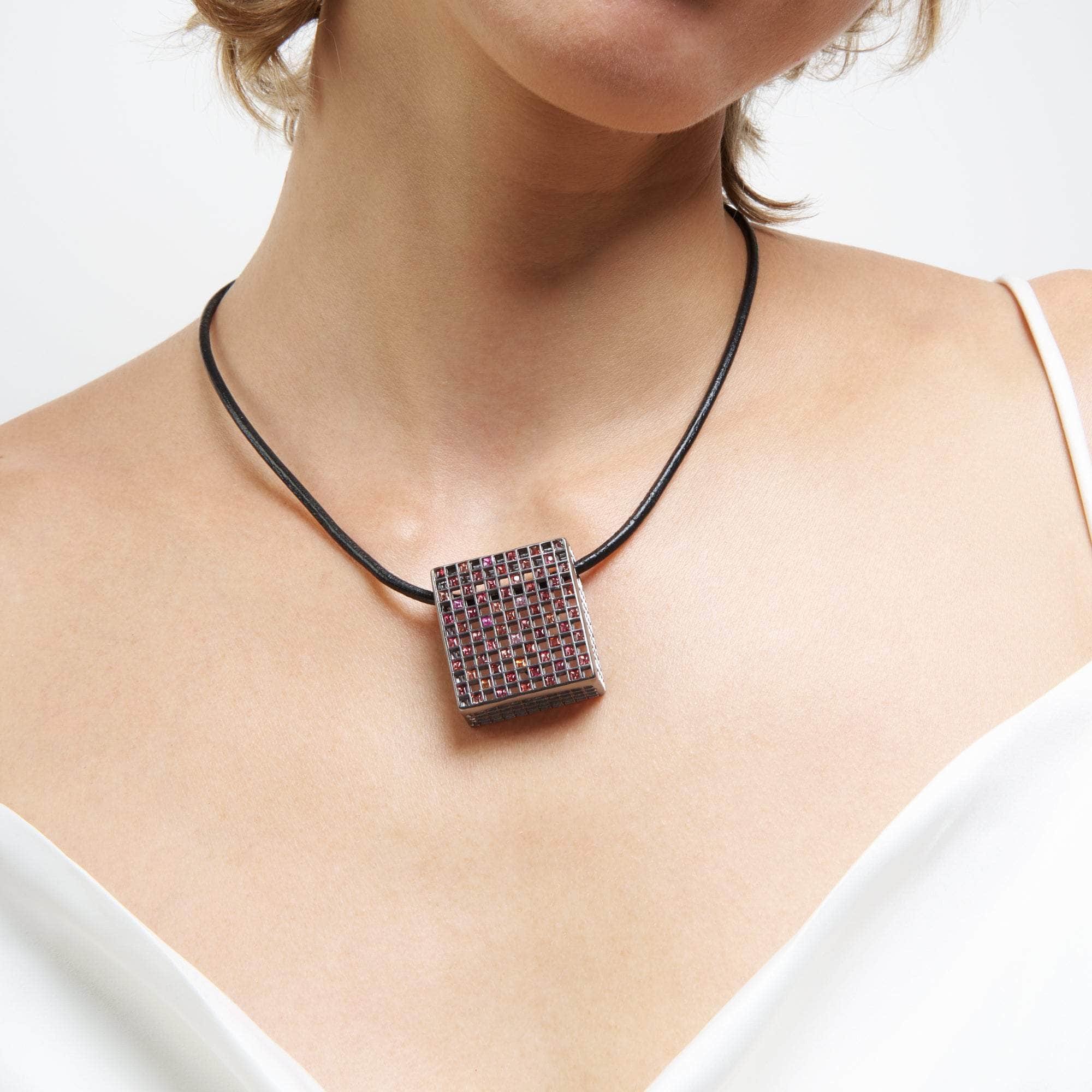 At first glance, this perfectly square, symmetrical design may appear to diverge from German Kabirski's signature quirky aesthetic, but it exudes a minimalistic elegance and unique charm. The lightweight, transparent 925 Silver base is plated with Black Ruthenium, featuring natural princess-cut Fancy Sapphires arranged in a precise chessboard pattern. This German Kabirski pendant is a one-of-a-kind creation, with no other piece like it.