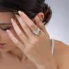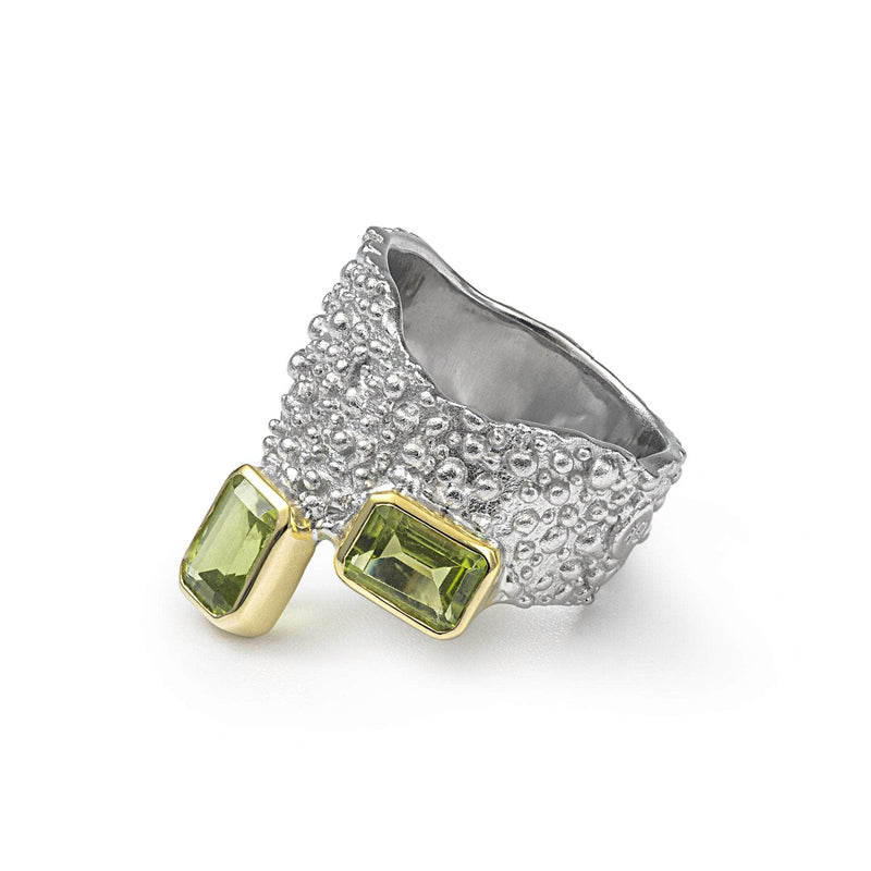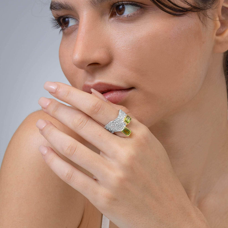 This ring from German Kabirski's Buds and Beans Collection defies traditional design with its unique arrangement of two octagon-cut Peridot gemstones, set in contrasting orientations—one vertical, the other horizontal. Crafted for those who value diverse perspectives and balanced contrasts, the dual plating of White Rhodium and 18K Gold adds depth to its intricate design. The band’s organic texture—a hallmark of Kabirski’s artistry—introduces an earthy, tactile element. This piece celebrates creativity and the harmony of blending contrasting elements into a unified and captivating design.