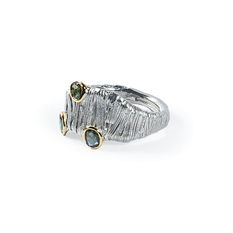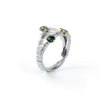 Crafted with an avant-garde vision by designer German Kabirski, this ring defies convention. It features 925 Silver plated with White Rhodium, showcasing a textured, organic pattern, and is embellished with natural Blue Sapphires set in 18K Gold. This exceptional piece is meant for those who embrace the unconventional and are ready for an offbeat adventure. There is only one in existence, representing a unique connection and a journey beyond the ordinary.