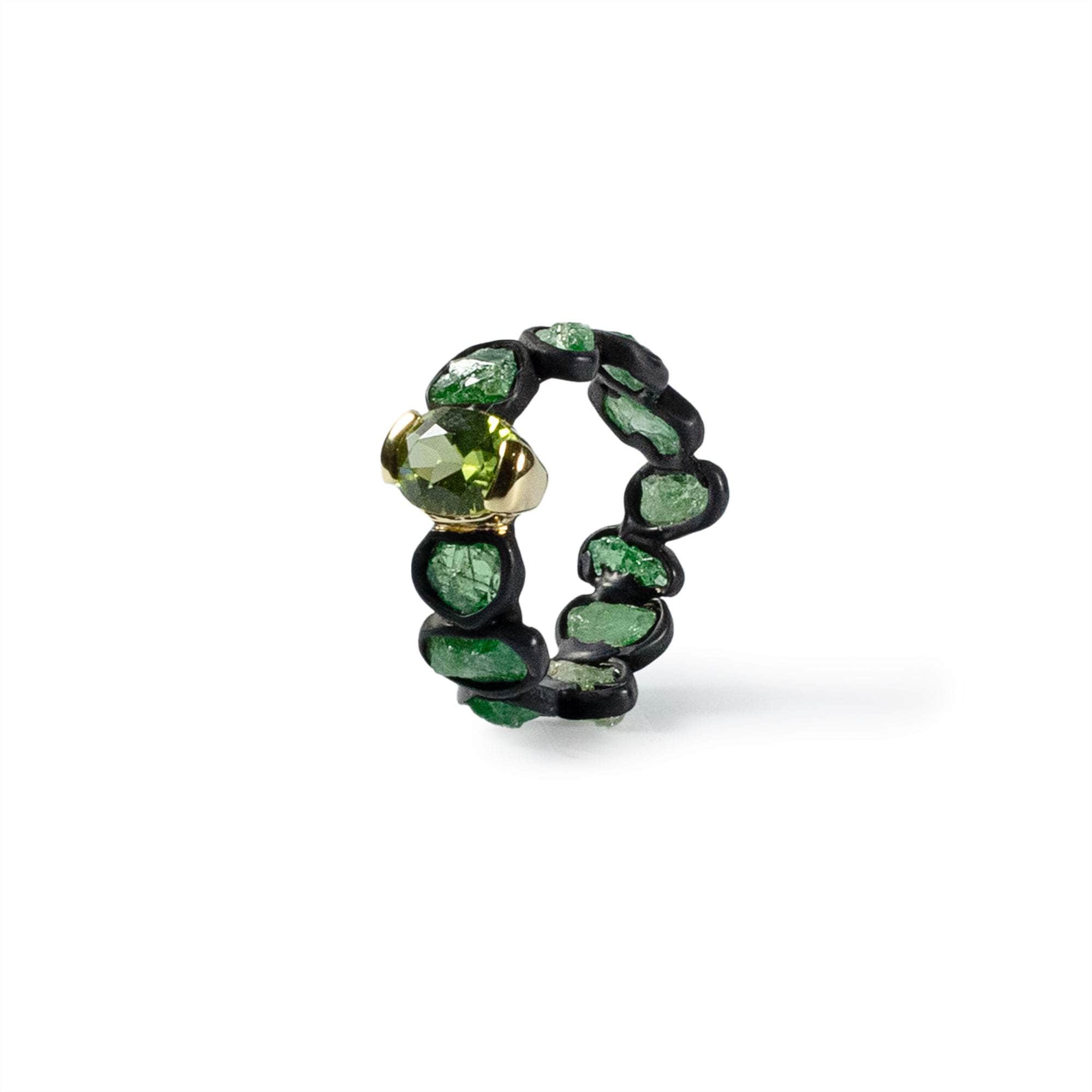 This ring defies convention with its bold, organic design. Handmade from silver and coated in 18K gold and Black Anthracite, it is both resilient and hypoallergenic. Raw, unrefined Tsavorite gemstones, left in their natural, irregular forms, adorn the band, untouched by any enhancements. At the center, a 6x8 mm oval-cut Peridot shines, elegantly framed in 18K gold. Ideal for those who embrace unaltered beauty, this piece pays homage to nature's wild elegance and untamed spirit.