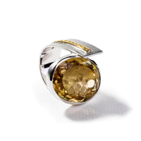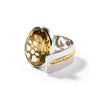 Introducing a unique designer creation made from silver, plated with white rhodium and 18K gold. At its center is a stunning oval-cut lemon quartz crystal, set within a perforated silver bowl, casting an enchanting optical illusion. As light and shadow pass through the stone, a mesmerizing play of reflections emerges. The band is adorned with a row of princess-cut mixed sapphires, adding a vibrant contrast of colors, a playful nod to the beauty that arises from unexpected combinations.