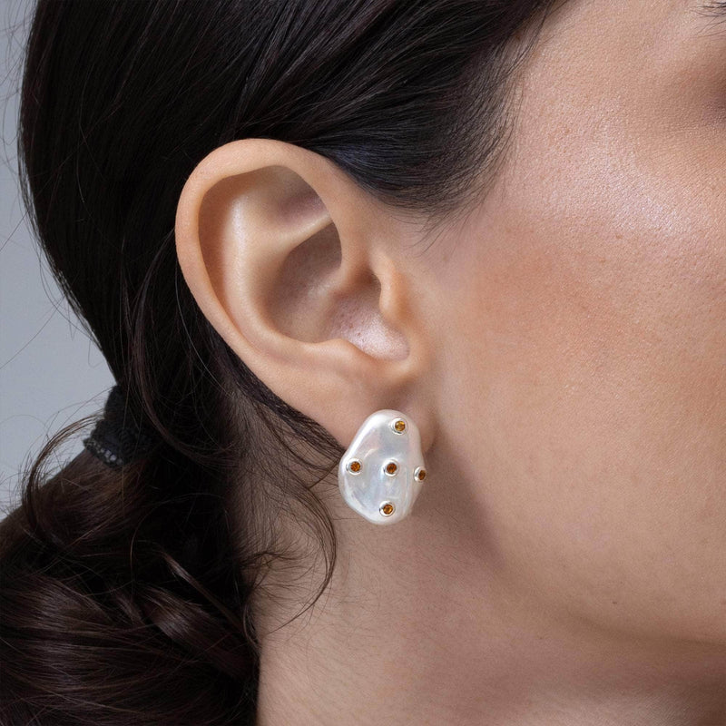 German Kabirski's newest earring design is a striking blend of art and individuality. Crafted from 925 silver and coated with white rhodium, part of the platinum family, these earrings are made to last and are hypoallergenic, suitable for all wearers. At their core are natural Baroque Pearls, each embellished with round-cut citrine accents integrated into the pearl. The materials and design appeal to those who view jewelry as an expression of personal identity, combining unconventional beauty with a unique sense of style.