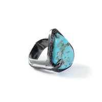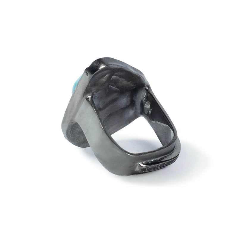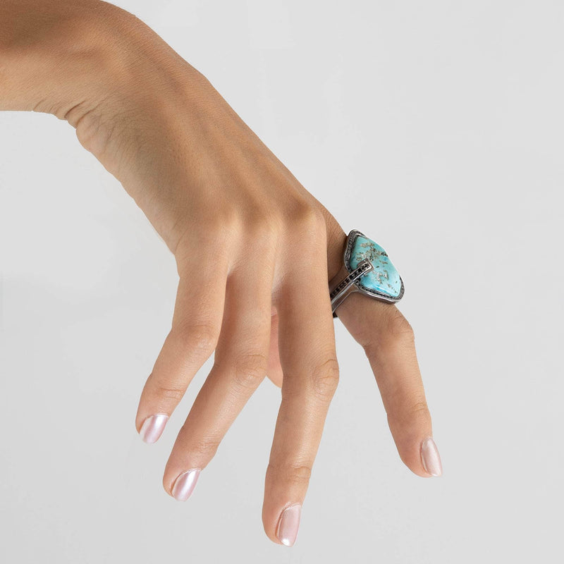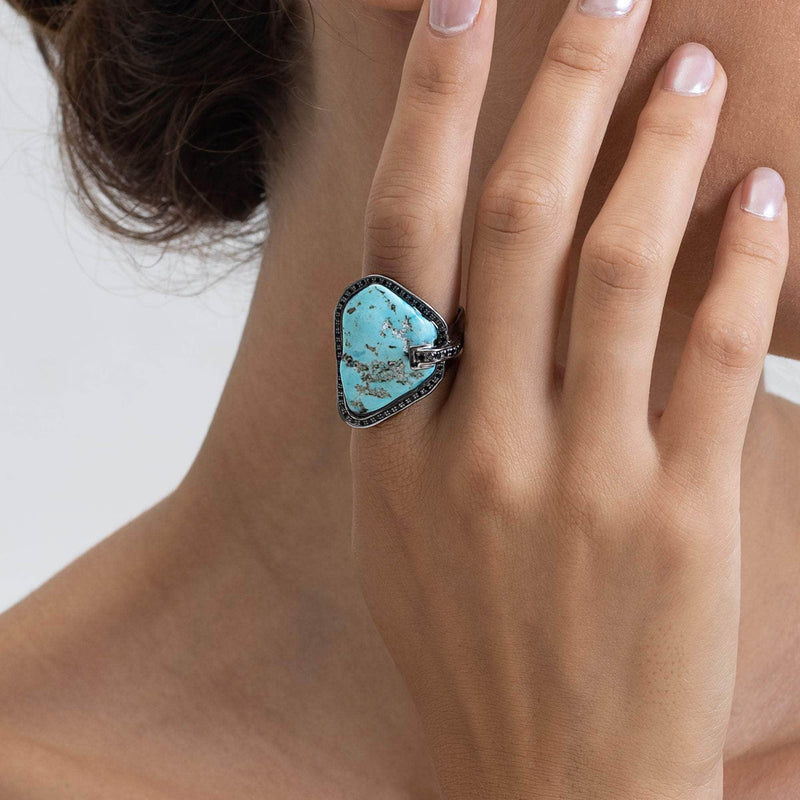This unique ring by German Kabirski is truly one-of-a-kind. Handcrafted from 925 Silver and coated with Black Rhodium for a dark, hypoallergenic finish, it showcases a raw Arizona Turquoise as the focal point. Renowned for its striking blue-green tones and natural matrix patterns, the Turquoise is accentuated by a line of Black Spinel that crosses the center stone and extends along the side of the band. Perfect for those who value artistic expression and a strong connection to nature, this ring is unmatched anywhere in the world.