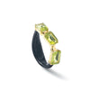 Presenting a geometric masterpiece from the Buds and Beans Collection, this designer ring embodies the vibrancy of life with its natural green gemstones. Crafted from silver and plated with black ruthenium, it boasts a sleek, modern aesthetic. The minimalist band is adorned with three octagon-cut natural peridots, adding a lively and refreshing element. Unconventional and contemporary, this ring is ideal for those looking to showcase their individuality with distinctive, standout jewelry.