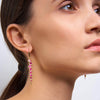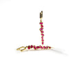 These handmade earrings are a signature creation by German Kabirski, embodying a dedication to unconventional jewelry. Crafted from gold-plated silver, they feature a striking row of uncut raw ruby crystals, honoring the untouched beauty of natural gemstones. Wearing them signifies an embrace of nature's treasures and artistic individuality. This design is available in various plating options, including 18K gold, black rhodium, and a unique combination of black rhodium and 18K gold.