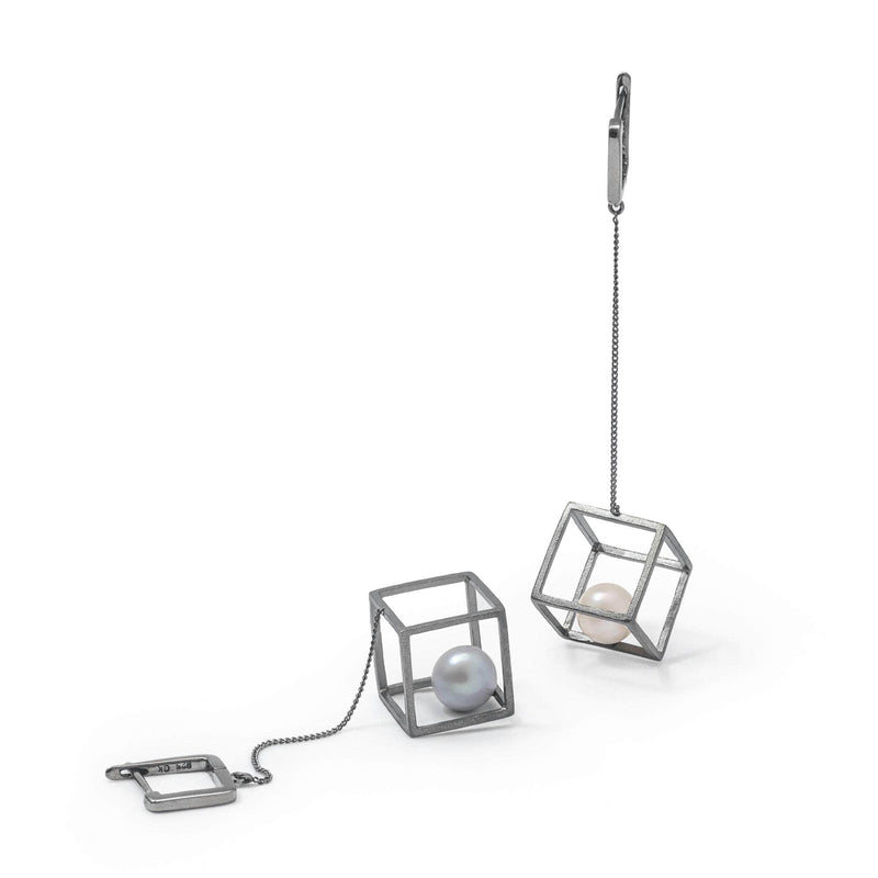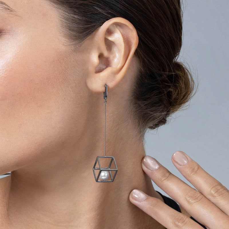These earrings, from the Freakwater Pearl collection, showcase silver cubes coated with Black Ruthenium. Inside each cube sits a natural pearl—one white and one gray—dangling from a fine chain. The design contrasts the structured cubes with the organic shapes of the pearls, resulting in a minimalist yet eye-catching look. These earrings are crafted to complement the Limpo White Pearl Pendant, creating a sophisticated and harmonious set that exudes understated elegance.