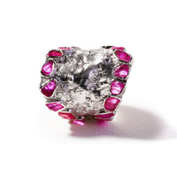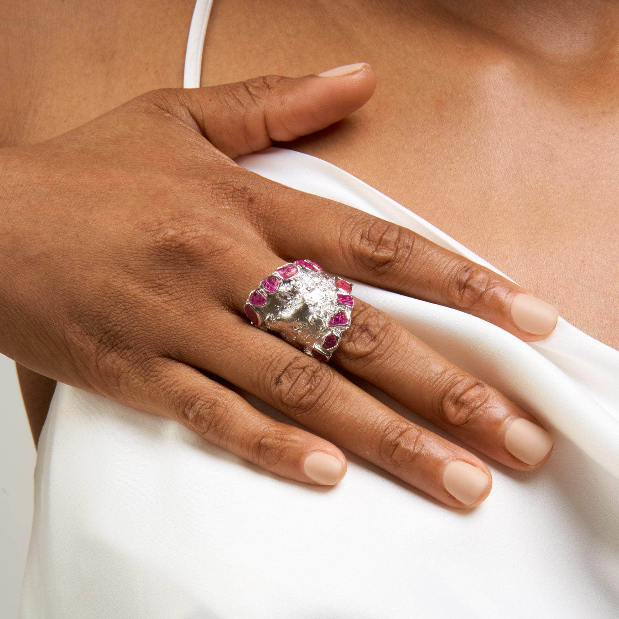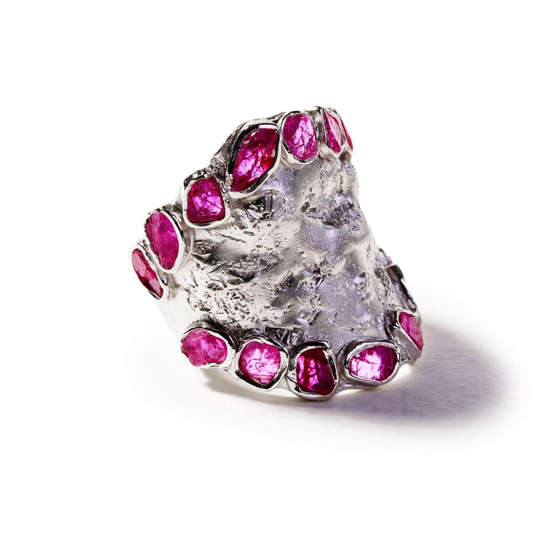 Natural raw rubies are scattered across the organically textured silver surface, coated with precious white rhodium. Reflecting the wabi-sabi philosophy of embracing life's perfect imperfections, this designer ring radiates its inherent energy to the wearer. Crafted as a one-of-a-kind piece, this ring stands apart, impossible to replicate.