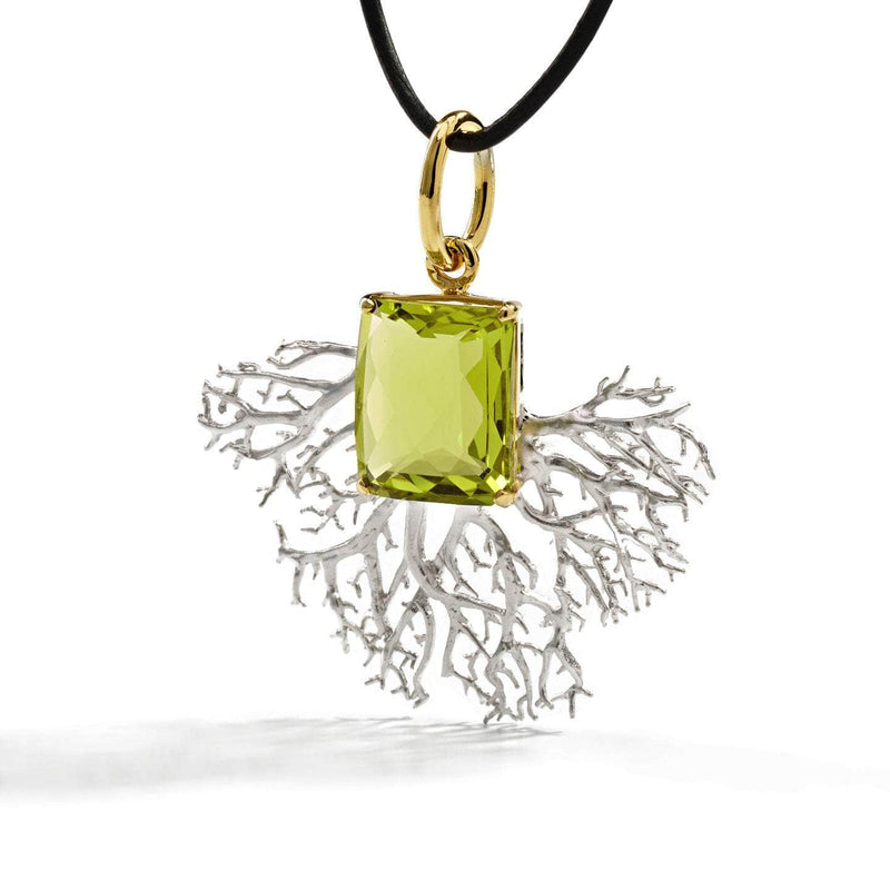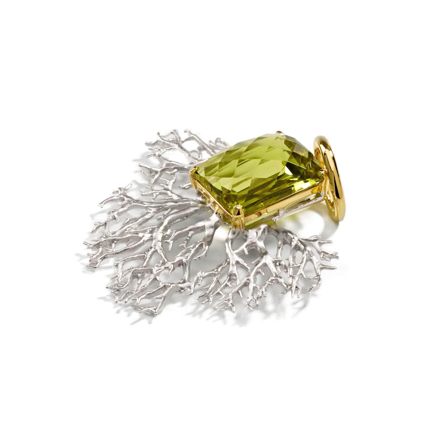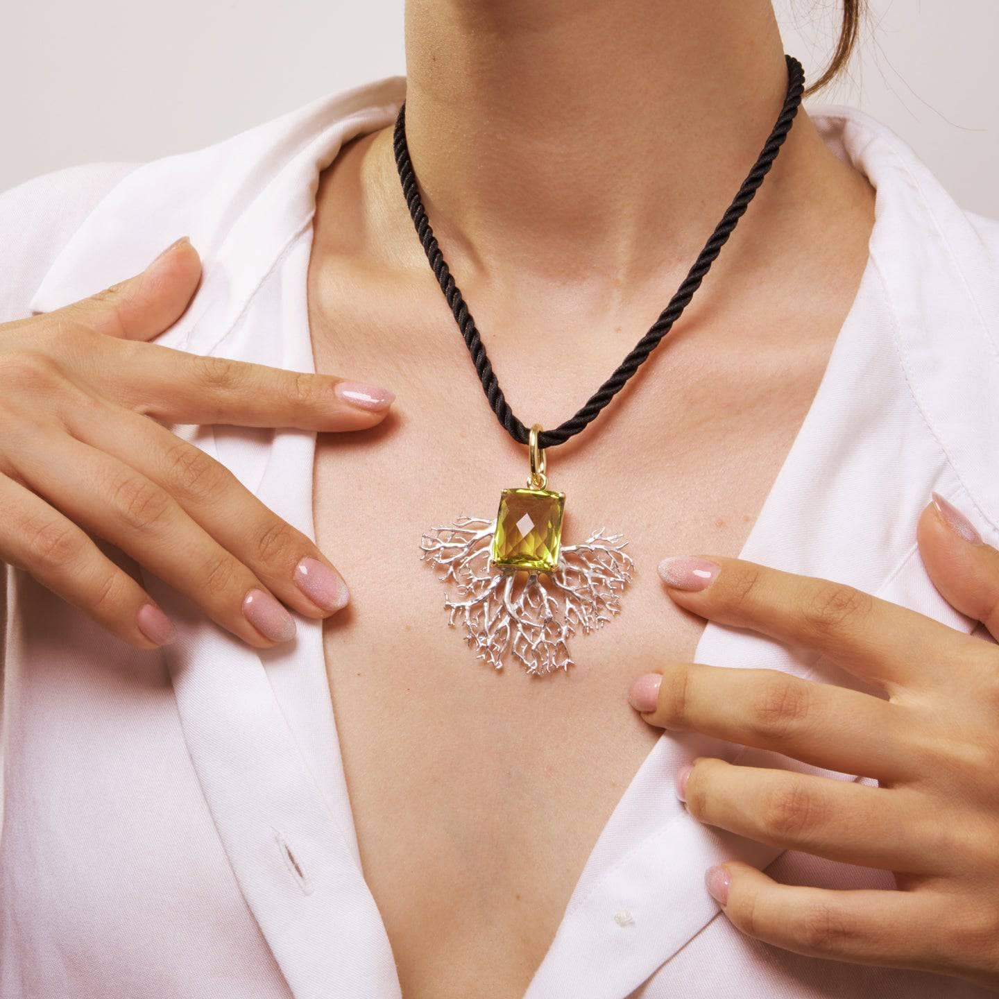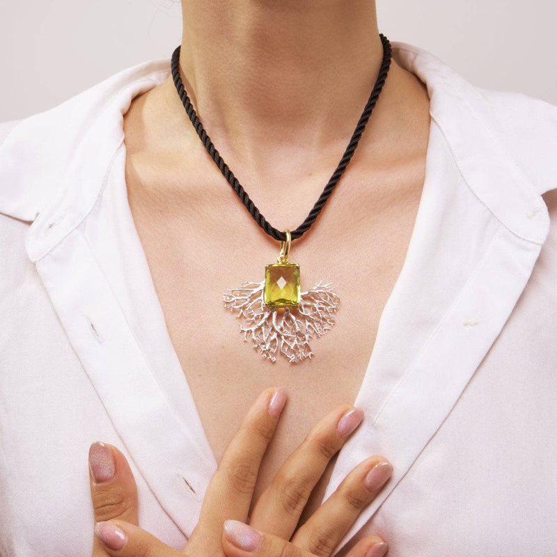 Organic tendrils of life extend outward in a call for expression, crafted from precious white rhodium. This pendant features gold accents and a stunning central lemon quartz that steals the spotlight. Unrefined and authentic, this piece is a true celebration of the natural beauty of the world.