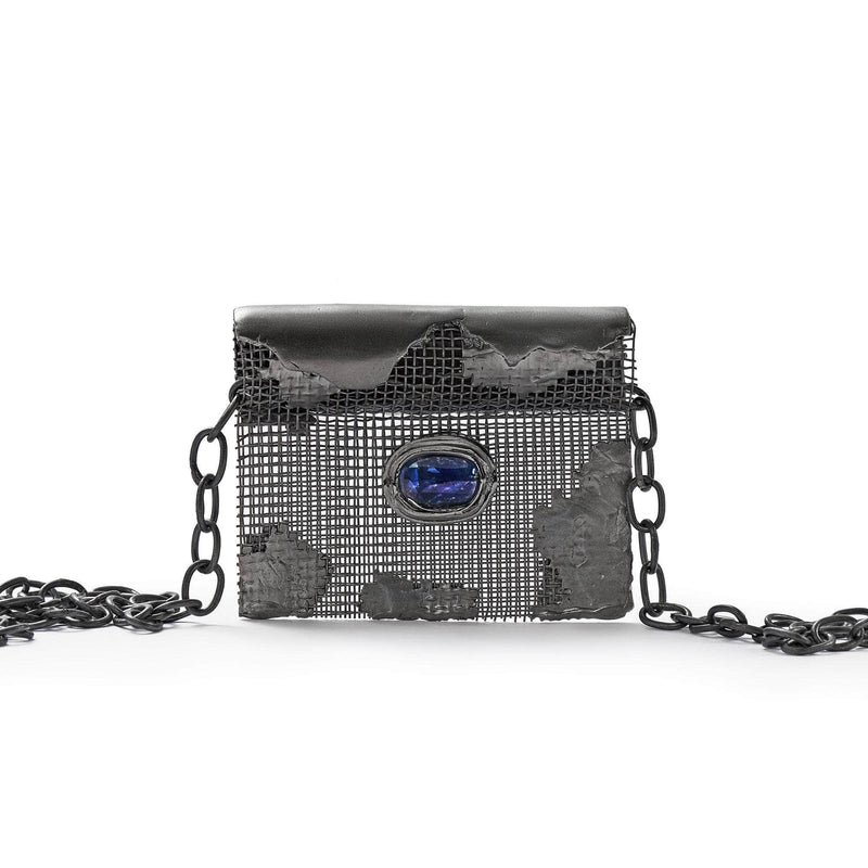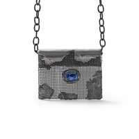 Introducing a groundbreaking designer necklace by German Kabirski, our exclusive creator. This piece blends silver and titanium mesh, offering a fresh, unconventional take on modern jewelry. It is coated in black rhodium and provides a sleek dark look, tarnish protection, and hypoallergenic wear. At its center is a raw blue sapphire, evoking an all-seeing eye that acts as a protective amulet, shielding you from the ordinary while enhancing creativity. This necklace is truly one of a kind, with no duplicates.