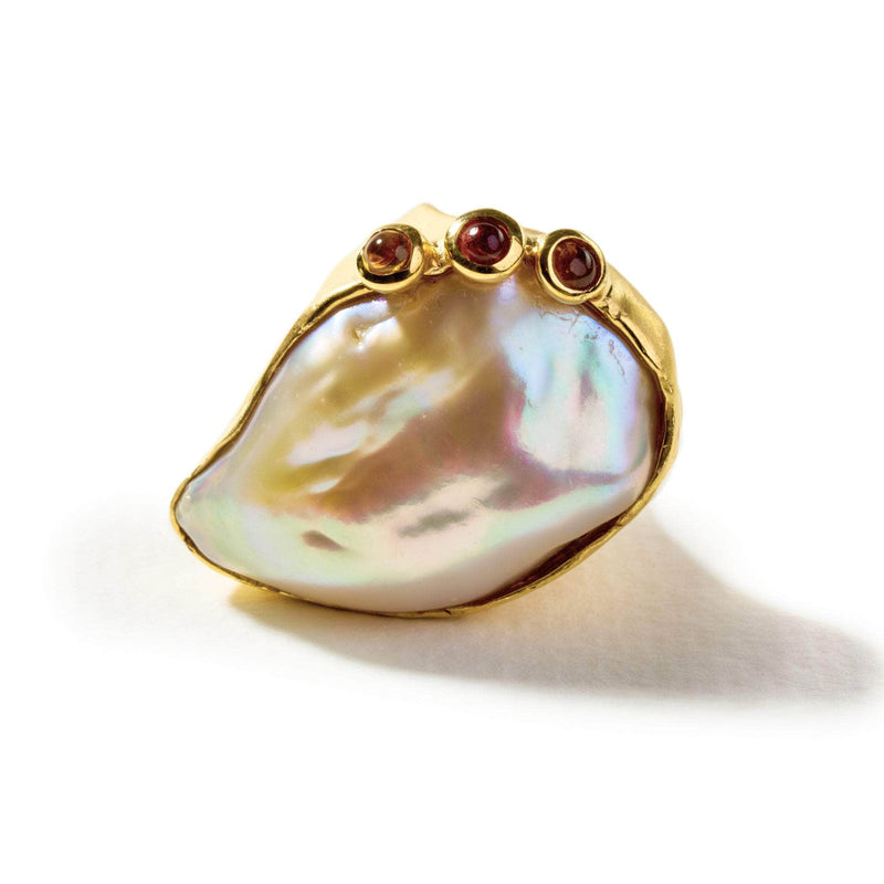 German Kabirski Marga Baroque Pearl and Pink Sapphire and Yellow Sapphire Ring