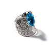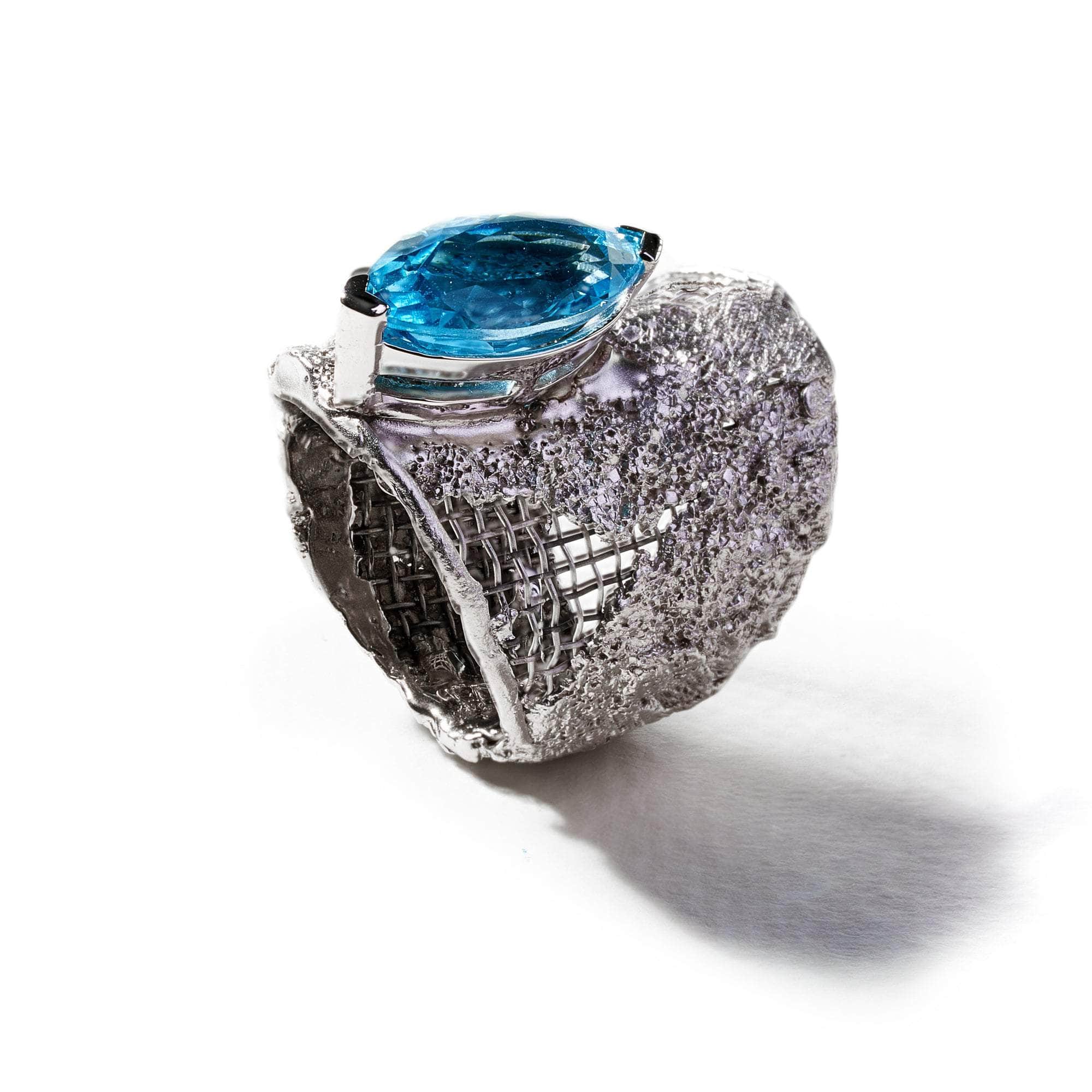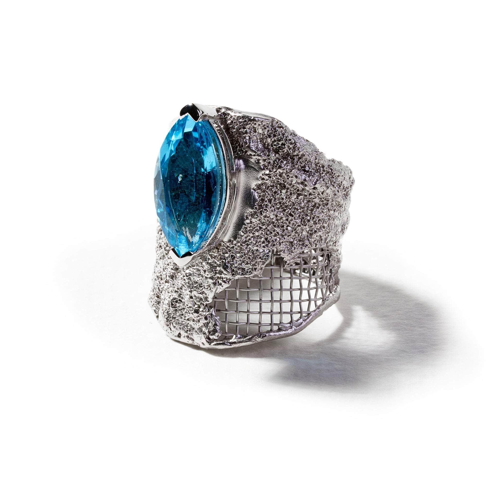 This designer ring is a tribute to chaos and unpredictability, blending fine silver with titanium mesh to challenge conventional jewelry norms. The ring showcases a playful mix of colors and textures, with a marquise-cut blue topaz at its center, serving as a vivid burst of brilliance. Embracing its raw, organic appeal, this unique contemporary piece defies the need for polished perfection and boldly stands out from traditional designs.