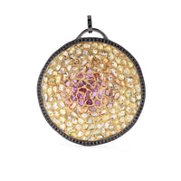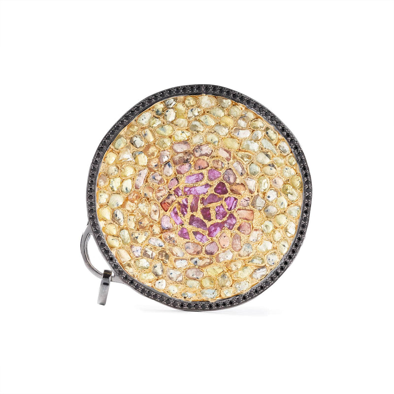 This bold, round pendant by rebellious designer German Kabirski defies traditional jewelry conventions. Made from sterling silver with black rhodium plating, it showcases a striking mix of raw Rough Chrysoberyl, Rough Ruby, and Rough Spessartine (Mandarin) Garnet gemstones. These stones remain in their untouched, natural state, free from human alterations or artificial treatments. Surrounding this daring arrangement is a border of round-cut Black Spinel, adding a sharp contrast. Ideal for those who appreciate bold, expressive jewelry, this piece is designed to stand out.