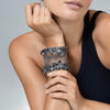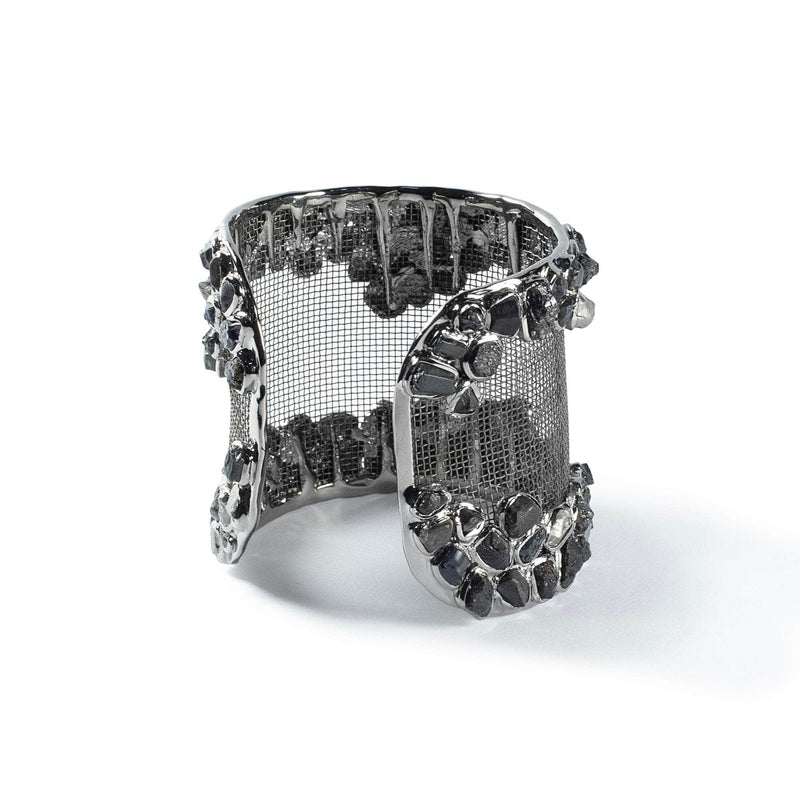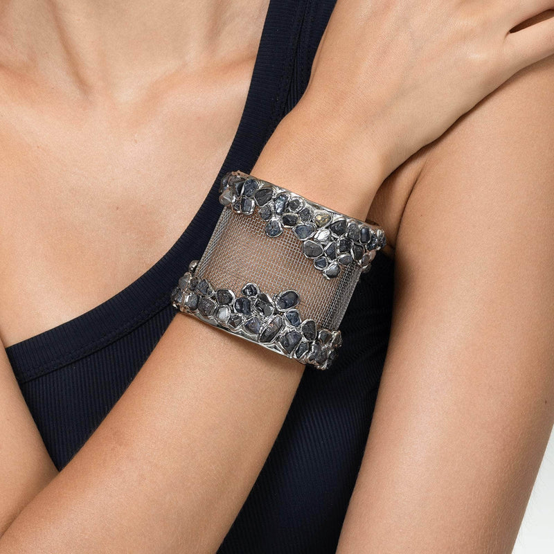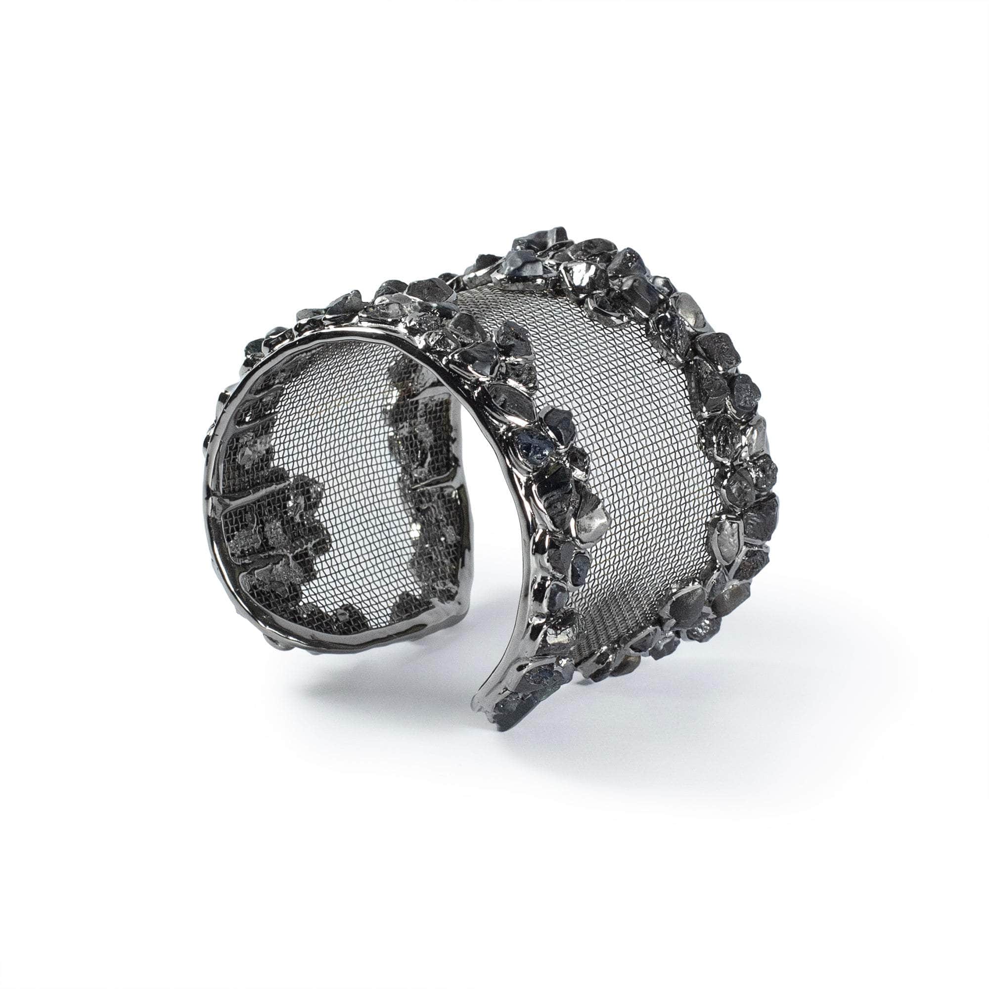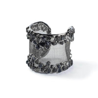 This modern bangle combines 925 silver with titanium mesh in a strikingly unconventional design. Adorned with raw black sapphires that evoke the look of barnacles clinging to a boat, each stone is uniquely set to emphasize its rugged, natural beauty. Created for bold self-expression, this piece celebrates the wild elegance of nature, offering more than traditional adornment.