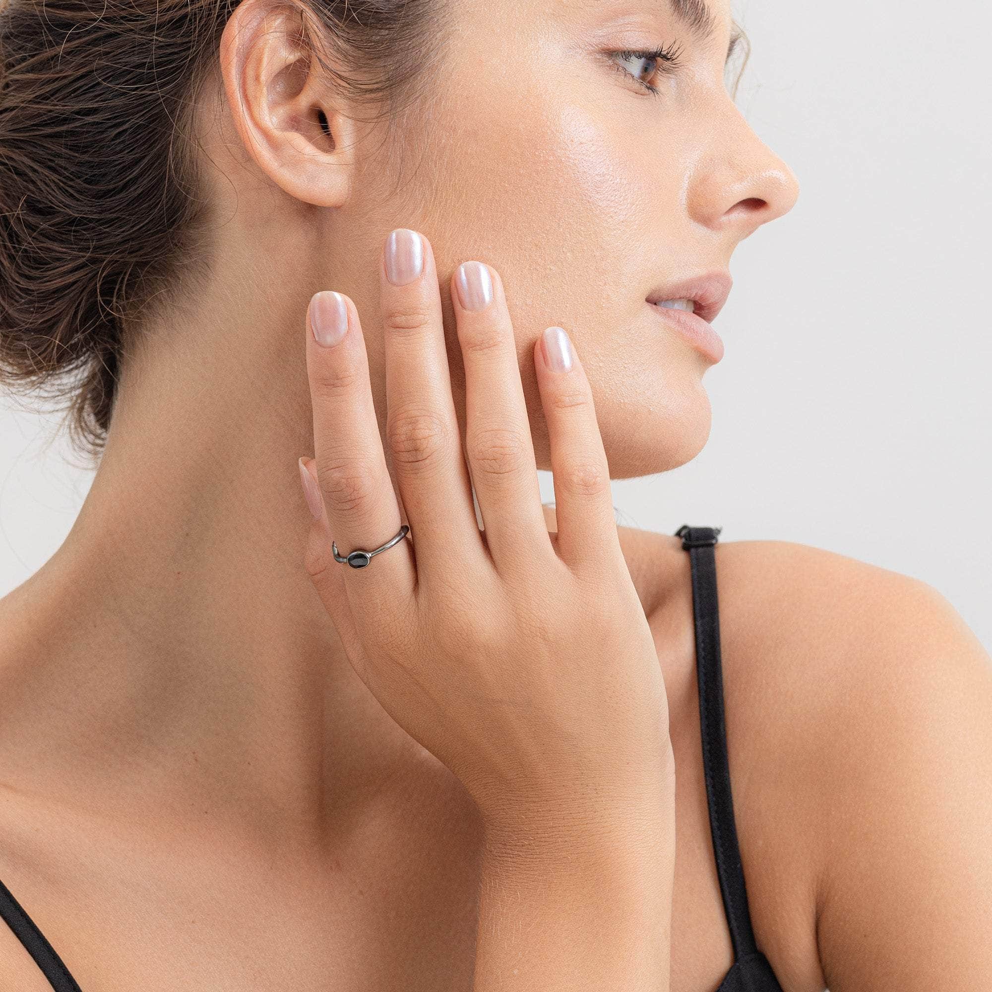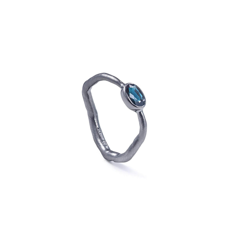 This designer silver ring features Black Rhodium plating, adding both a dark allure and protection against oxidation. The band’s irregular, organic shape embraces the beauty of natural imperfections, showcasing a 4x6 mm oval-cut Blue Sapphire at its center. Ideal for minimalist styling or paired with other pieces from the Shuffle Collection, this ring lets you mix and match to express your unique style and mood.
