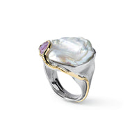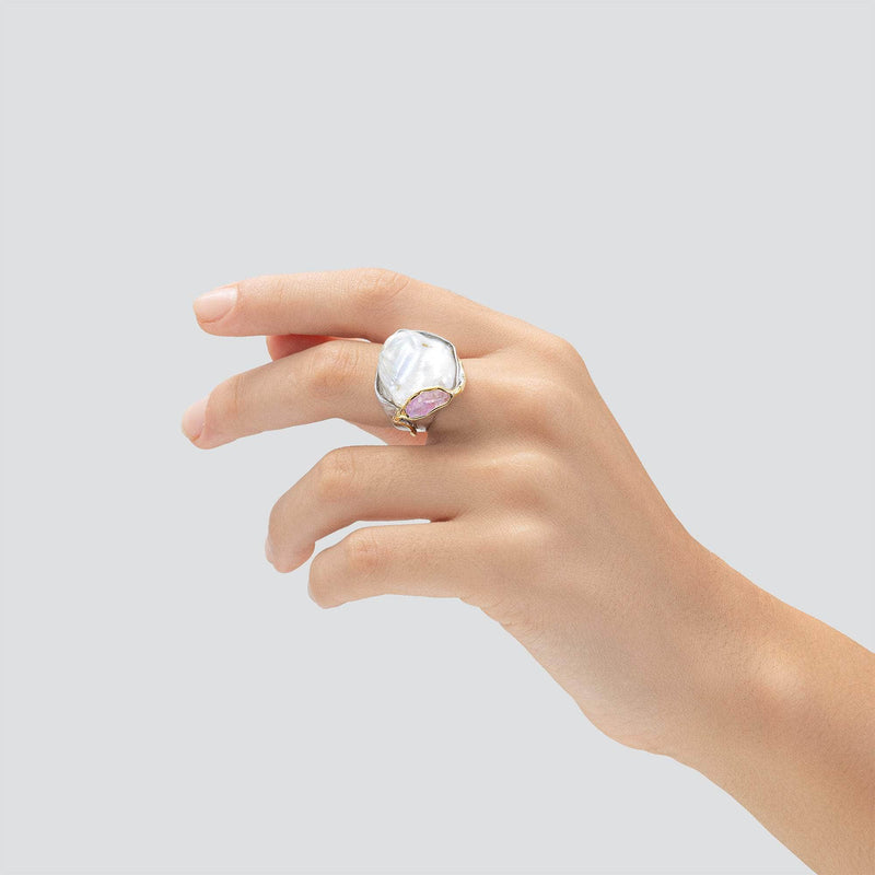 This artisanal silver ring, plated in White Rhodium and accented with 18K Gold, highlights a stunning natural Baroque Pearl that celebrates the organic allure of freshwater pearls. Adding to its unique charm is a raw Pink Sapphire crystal, left unpolished in its natural form, showcasing its authentic beauty. This piece blends nature’s raw elegance with contemporary design, perfect for those who admire the unrefined beauty and intrigue of the natural world.