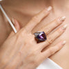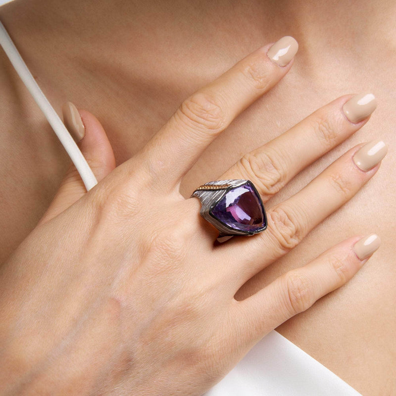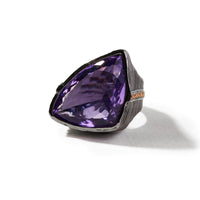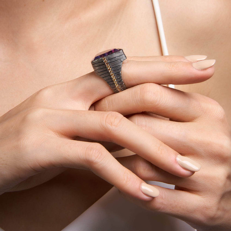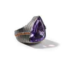 This modern ring radiates a rebellious vibe through its unique design. At its center is a strikingly large, fancy-cut amethyst that makes a bold statement. A line of round-cut orange sapphires adds a playful twist. This ring challenges conventional styles and celebrates individuality, making it ideal for those who enjoy the more unconventional aspects of jewelry.