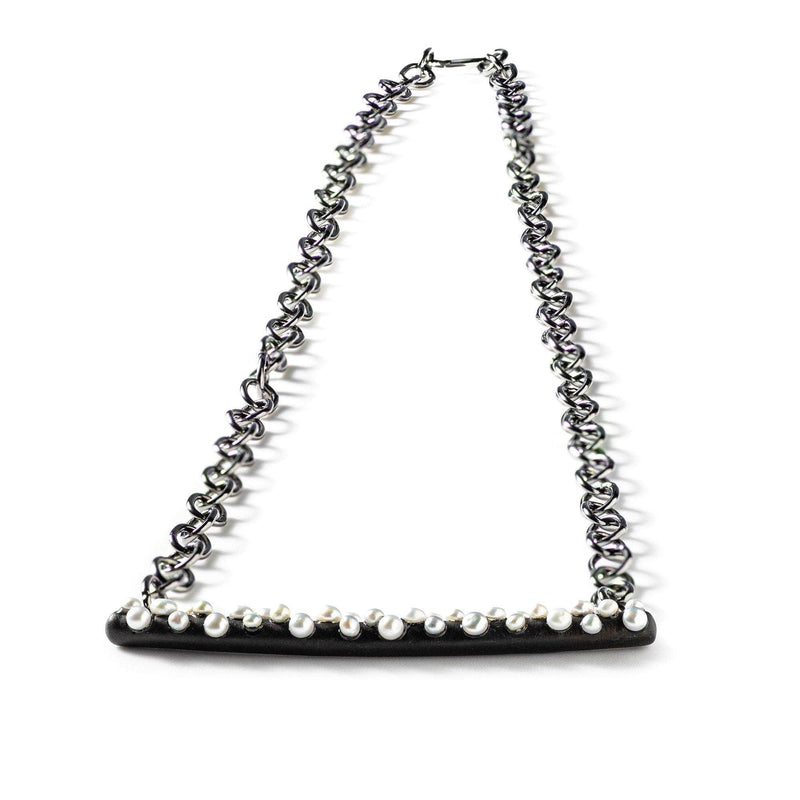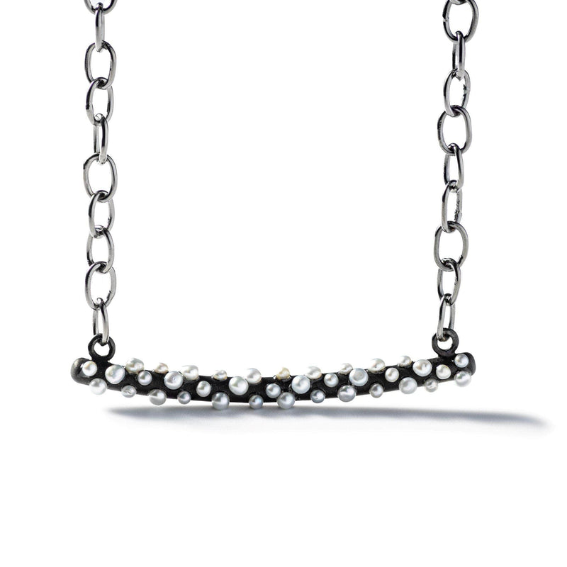 This silver necklace, plated in Anthracite, is a fresh and playful addition to the Freakwater Pearl Collection. With a modern, artistic design, it's made for those looking to showcase their true self. Decorated with scattered white micro pearls, the necklace delivers a bold and striking statement. Ideal for those who admire unique and expressive jewelry, this contemporary piece stands out for its combination of elegance and individuality.