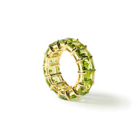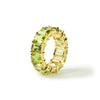 This ring from German Kabirski's latest "Buds and Beans" collection is crafted to highlight the beauty of its gemstones. It features natural octagon-cut Peridots, each sized 5x7 mm, connected by minimal 18K Gold-plated Sterling Silver. The delicate use of metal allows the gemstones to take center stage, creating an open, airy design that catches and reflects light beautifully. This piece celebrates a fresh, green aesthetic, ideal for those who love an organic and natural look in their jewelry.