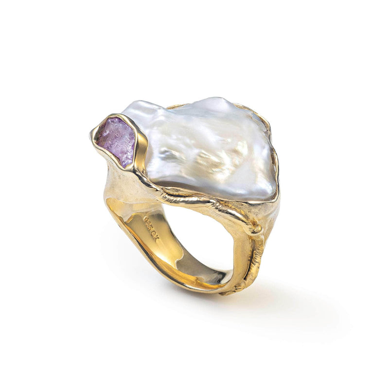 From the distinctive Freakwater Pearl Collection comes another remarkable piece, celebrating the diversity of pearls through a rebellious, artistic lens. This ring embodies the beauty of nature, imperfection, and the ephemeral, crafted entirely from 925 Silver with a luxurious 18K Gold plating. Showcasing a large Baroque Pearl paired with an unpolished raw ruby crystal, it aligns with the collection’s philosophy of highlighting gems in their natural, untouched state. This piece celebrates the raw elegance found in nature’s imperfections, embracing the unrefined beauty of earth's treasures.