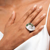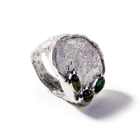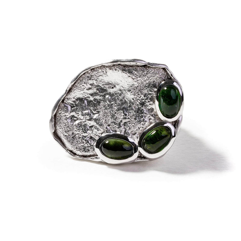 Three natural oval cabochon tourmalines rest upon the textured silver surface, resembling cosmic eggs on the cusp of hatching—each holding the power of a wish. Make each one meaningful and let the magic unfold.