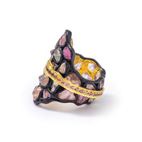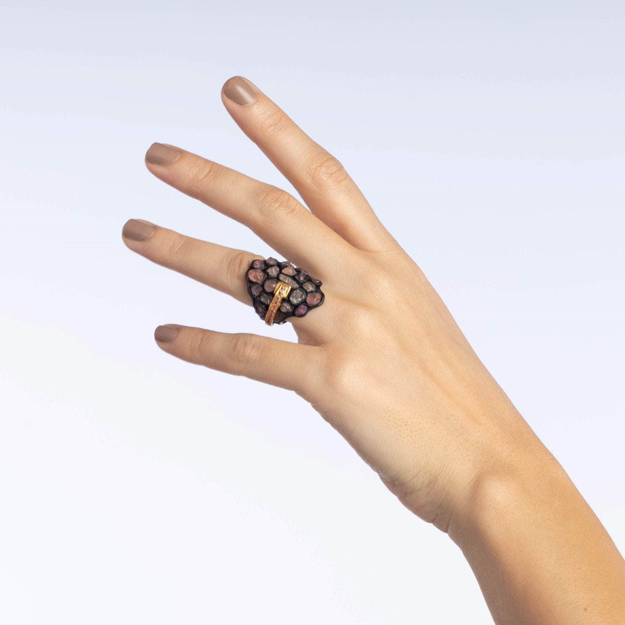 This distinctive ring by German Kabirski embraces the raw, natural beauty of unpolished stones. Featuring rough mixed spinel gems encased in silver and arranged like a delicate puzzle, the stones are left in their untouched, natural state. A striking line of round-cut orange sapphires adds a vibrant contrast along the side of the wide band. Made from 925 silver and plated with deep-black Anthracite and 18K gold, this ring celebrates the imperfections and natural charm that make each stone, and each person, uniquely beautiful.
