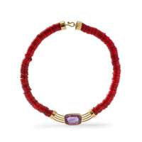 This stunning designer necklace is crafted from 925 silver plated with 18K Gold for added durability and hypoallergenic wear. It highlights a large, fancy-cut Amethyst (15x17 mm) alongside a raw red coral, repurposed from vintage necklaces sourced at flea markets. By utilizing only pre-existing materials, we support environmental sustainability and help preserve coral reefs. This unique piece elegantly combines nature with artistic design, making it a bold contemporary statement.