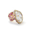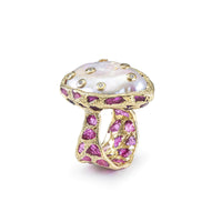 Introducing a contemporary designer ring, crafted from 14K gold, featuring a large natural Baroque pearl accented by 7 round-cut diamonds. The centerpiece is set on an innovative gold band adorned with raw ruby crystals, all connected through German Kabirski’s unique "Stained Glass" technique—a design approach found in no other traditional or modern jewelry. This one-of-a-kind wearable art piece exudes bold authenticity and unconventional beauty.