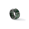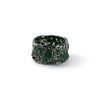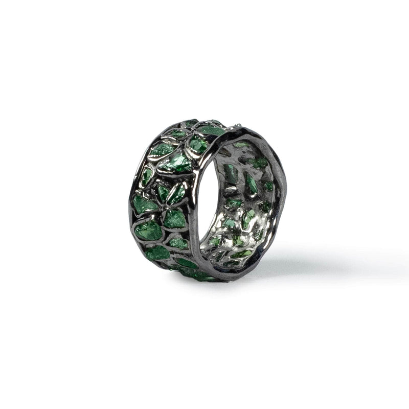 This wide-band ring is crafted from raw Chrome Diopside crystals using German Kabirski's signature Stained Glass technique. Each crystal is wrapped in silver and arranged to create a stunning natural kaleidoscope effect. Part of the Buds and Beans Collection, the ring features a variety of green gemstones, celebrating the beauty of nature.